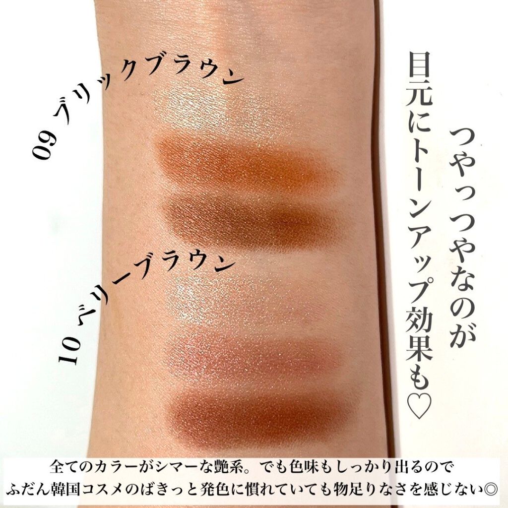 - 3色で簡単に明るく大きな目元に。 しっとり感触のアイシャドウ。 くすみを飛ばす明るさベース、ひとえ・奥二重の方でも幅広く塗れる肌なじみの良い中間色、 濃密高発色の締め色が目の輪郭を強調し大きな目元に。 微細パール配合でくすみを飛ばし、明るい目元へ。