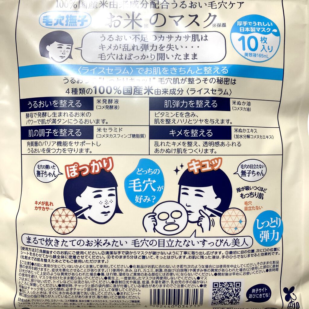 - 乾燥毛穴にお米のマスク!100%国産米由来成分ライスセラム(コメ発酵液、コメヌカ油、コメヌカスフィンゴ糖脂質、加水分解コメヌカエキス:保湿成分)配合。うるおって、しっとりキュッと毛穴肌を整えます。まるで炊きたてのお米みたい、毛穴の目立たないすっぴん美人に!厚手でうれしい日本製マスク。