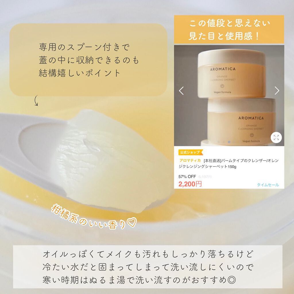 @aromatica.jp様より、オレンジクレンジングシャーベットをいただきました。たっぷり入ったジャータイプ。オレンジシャーベットみたい!テクスチャーもシャーベットみたいで、使うのが楽しいです。肌の上でとろけて、優しくメイクになじませること...
