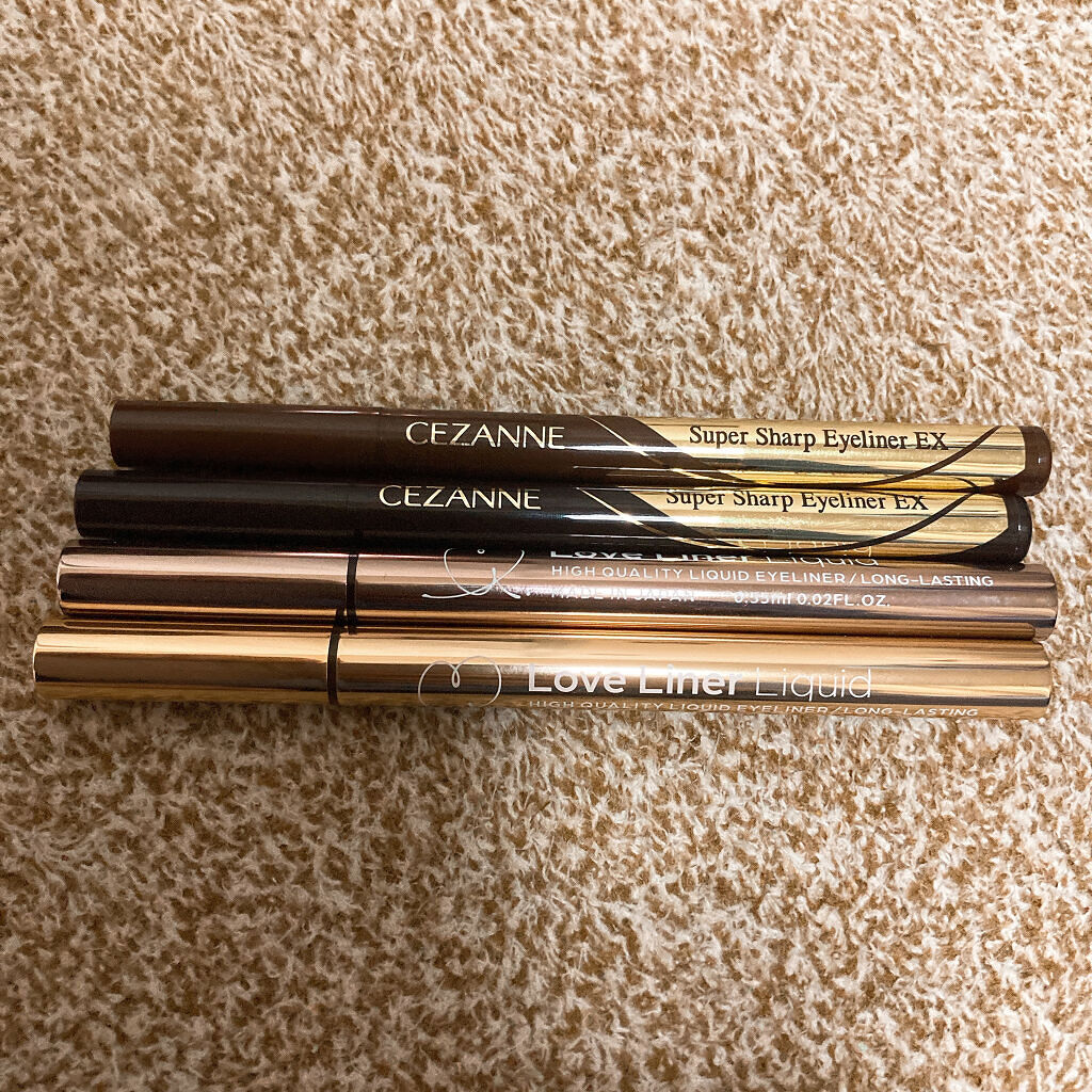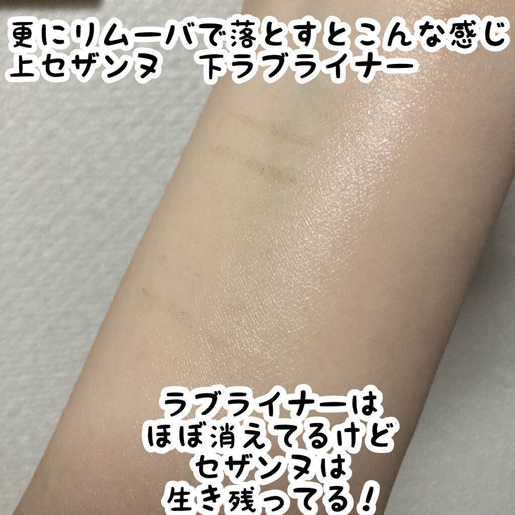 書き心地はどちらも良くて確かに細く書くならセザンヌかなーとは思うけどラブライナーも普通に細くかける。 色味はめっちゃ似てるけどダークブラウンはラブライナーの方が暗めな気がする。 リムーバを使って少し落とした段階ではあまり落ち具合変わらないけどちゃんと落とすとまさかのセザンヌが生き残ってラブライナー脱落という結果。