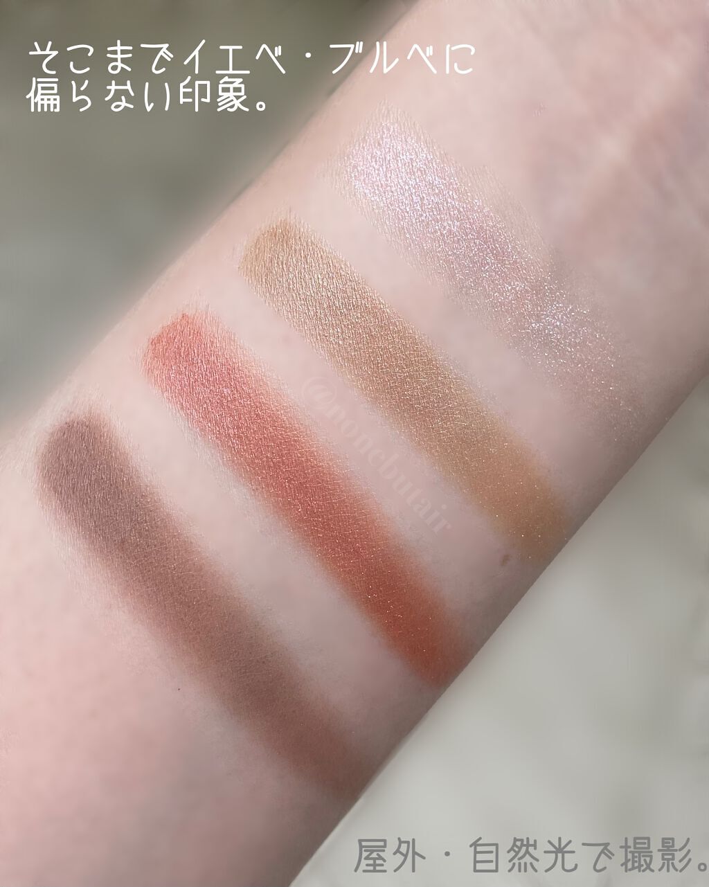 こちら完全に好みのカラーで、わたくし脊髄反射で購入いたしました。では、実際に何度かメイクをしてみて感じたことをお伝えしますね♪※写真の撮影環境はすべて、室内・自然光(薄曇り)のみで加工なしです。まずは真ん中の色以外でのメイク。真ん中以外はベー...