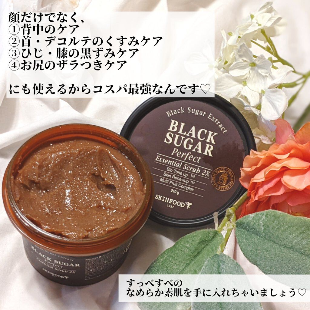 スキンフードのベストセラー 私が初めて購入品した ブラックシュガースクラブ🤎 古い角質と皮脂ケア ✰2種類あるブラックシュガースクラブのうち、エッセンシャルオイル※配合&スクラブが細かくなり、比較的マイルドなテクスチャー 顔だけでなくボディにも使えるマルチスクラブ 10分ほど顔にのせた後、やさしく洗い流すと、なめらかな感触&しっとり仕上げ