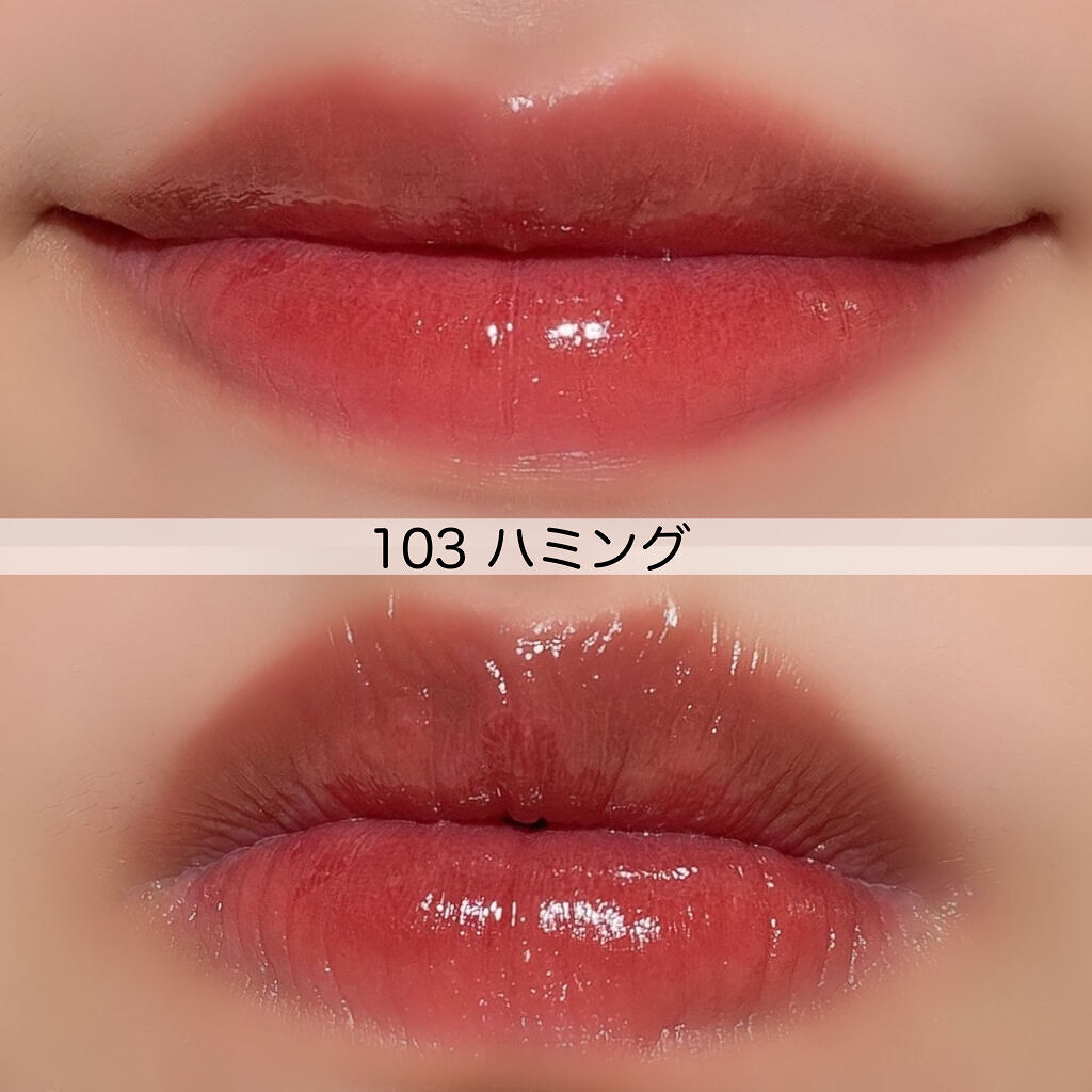 - <101 ジョイフル> 水、リンゴ酸ジイソステアリル、ダイマージリノール酸(フィトステリル/イソステアリル/セチル/ステアリル/ベヘニル)、ジイソステアリン酸ダイマージリノレイル、ノナイソステアリン酸ポリグリセリル-10、オクチルドデカノール、ビスジグリセリルポリアシルアジペート-2、水添ポリイソブテン、セチルPEG/PPG-10/1ジメチコン、ポリソルベート60(小麦由来)、イソステアリン酸ソルビタン(小麦由来)、1,2-ヘキサンジオール、グリセリン、ベヘニルアルコール、(アクリル酸/MA)コポリマーNa、ペンチレングリコール、BG、ポリアクリレート-13、トロメタミン、(アクリレーツ/アクリル酸アルキ ル(C10-30 )クロスポリマー、エチルヘキシルグリセリン、ポリイソブテン、(アクリル酸ヒドロキシエチル/アクリロイルジメチルタウリンNa)コポリマー、スクワラン、デヒドロ酢酸、ステビオシド、香料、フィチン酸、カプリリルグリコール、ジメチコン、水添ロジン酸メチル、水酸化Al、ポリソルベート20(小麦由来)、トコフェロール、ライム果汁、キイチゴ果汁、レモン果汁、マンゴー果汁、フラガリアチロエンシス果汁、アンズ果汁、オレンジ果汁、グレープフルーツ液汁、キウイ果汁、パパイア果汁、[+/-]酸化チタン、黄4、黄5、赤 104(1)、赤227、青1 <102 デューイ> 水、リンゴ酸ジイソステアリル、ダイマージリノール酸(フィトステリル/イソステアリル/セチル/ステアリル/ベヘニル)、ジイソステアリン酸ダイマージリノレイル、ノナイソステアリン酸ポリグリセリル-10、オクチルドデカノール、ビスジグリセリルポリアシルアジペート-2、水添ポリイソブテン、セチルPEG/PPG-10/1ジメチコン、ポリソルベート60(小麦由来)、イソステアリン酸ソルビタン(小麦由来)、1,2-ヘキサンジオール、グリセリン、ベヘニルアルコール、(アクリル酸/MA)コポリマーNa、ペンチレングリコール、BG、ポリアクリレート-13、トロメタミン、(アクリレーツ/アクリル酸アルキル(C10-30))クロスポリマー、エチルヘキシルグリセリン、ポリイソブテン、(アクリル酸ヒドロキシエチル/アクリロイルジメチルタウリンNa)コポリマー、スクワラン、デヒドロ酢酸、ステビオシド、香料、フィチン酸、ジメチコン、水添ロジン酸メチル、水酸化Al、カプリリルグリコール、ポリソルベート20(小麦由来)、トコフェロール、ライム果汁、キイチゴ果汁、レモン果汁、マンゴー果汁、フラガリアチロエンシス果汁、アンズ果汁、オレンジ果汁、グレープフルーツ液汁、キウイ果汁、パパイア果汁、酸化チタン、赤227、黄5、黄4、青1 <103 ハミング> 水、リンゴ酸ジイソステアリル、ダイマージリノール酸(フィトステリル/イソステアリル/セチル/ステアリル/ベヘニル)、ジイソステアリン酸ダイマージリノレイル、ノナイソステアリン酸ポリグリセリル-10、オクチルドデカノール、ビスジグリセリルポリアシルアジペート-2、水添ポリイソブテン、セチルPEG/PPG-10/1ジメチコン、ポリソルベート60(小麦由来)、イソステアリン酸ソルビタン(小麦由来)、1,2-ヘキサンジオール、グリセリン、ベヘニルアルコール、(アクリル酸/MA)コポリマーNa、ペンチレングリコール、BG、ポリアクリレート-13、トロメタミン、(アクリレーツ/アクリル酸アルキル(C10-30))クロスポリマー、エチルヘキシルグリセリン、ポリイソブテン、(アクリル酸ヒドロキシエチル/アクリロイルジメチルタウリンNa)コポリマー、スクワラン、デヒドロ酢酸、ステビオシド、香料、フィチン酸、ジメチコン、水添ロジン酸メチル、水酸化Al、カプリリルグリコール、ポリソルベート20(小麦由来)、トコフェロール、ライム果汁、キイチゴ果汁、レモン果汁、マンゴー果汁、フラガリアチロエンシス果汁、アンズ果汁、オレンジ果汁、グレープフルーツ液汁、キウイ果汁、パパイア果汁、酸化チタン、黄5、赤227、青1 <104 チェリー> 水、リンゴ酸ジイソステアリル、ダイマージリノール酸(フィトステリル/イソステアリル/セチル/ステアリル/ベヘニル)、ジイソステアリン酸ダイマージリノレイル、ノナイソステアリン酸ポリグリセリル-10、オクチルドデカノール、ビスジグリセリルポリアシルアジペート-2、水添ポリイソブテン、セチルPEG/PPG- 10/1ジメチコン、イソステアリン酸ソルビタン(小麦由来)、ポリソルベート60(小麦由来)、1,2-ヘキサンジオール、グリセリン、ベヘニルアルコール、(アクリル酸/MA)コポリマーNa、ペンチレングリコール、BG、ポリアクリレート-13、ト ロメタミン、(アクリレーツ/アクリル酸ア ルキル(C10-30))クロスポリマー、エチルヘキシルグリセリン、ポリイソブテ ン、(アクリル酸ヒドロキシエチル/アクリ ロイルジメチルタウリンNa)コポリマー、スクワラン、デヒドロ酢酸、ステビオシド、香料、カプリリルグリコール、ポリソルベー ト20(小麦由来)、トコフェロール、ライム果汁、キイチゴ果汁、レモン果汁、マンゴー 果汁、フラガリアチロエンシス果汁、アンズ 果汁、オレンジ果汁、グレープフルーツ液 汁、キウ