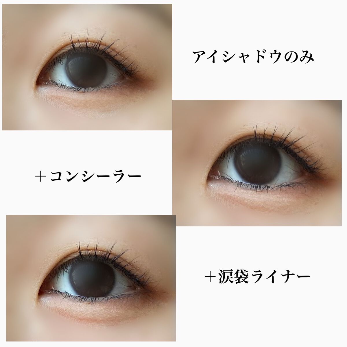 テクスチャーはみずみずしい分カバー力が物足りない。完全に隠れませんって訳じゃないけどカバーしきれない感じ。 塗り心地はいいんですよ。テクスチャーが重くないので崩れた時も汚くならないし。 だけど…私の頑固なクマにはこのコンシーラーは気持ち隠す程度でした。カバーしすぎると汚くなっちゃうので、これくらいがいいのかな🤔 薄いクマ隠し・眉毛の剃り跡の青いところはちゃんと隠れる◎