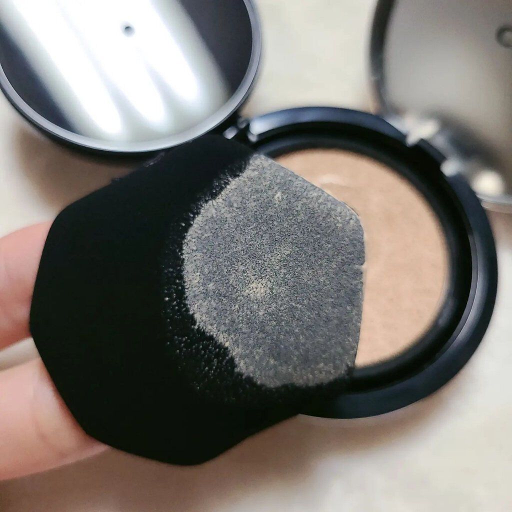 クッションを押すとジワ~っとファンデーションがつきます。 肌につけた感じはしっかりしたカバー力でつや感のある仕上がりです。 少し塗りムラを感じますがムラがでるところを手で馴染ませれば全然大丈夫💮 毛穴もしっかりカバーできています。 そして、密着力が高くマスクにもつきにくい! このつや感のある仕上がりが私はめっちゃ大好きです💖