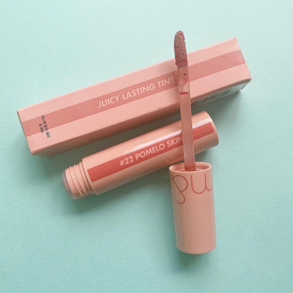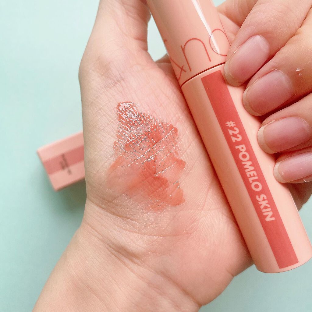 \ガラスのようなツヤ感/【ロムアンド】ジューシーラスティングティント22POMELOSKINオレンジ寄りのくすみベージュで肌なじみ抜群。透け感もある淡い発色、とても使いやすい粘膜カラーで特にイエベの方が万能使いできるナチュラル系ティント💄✨初...