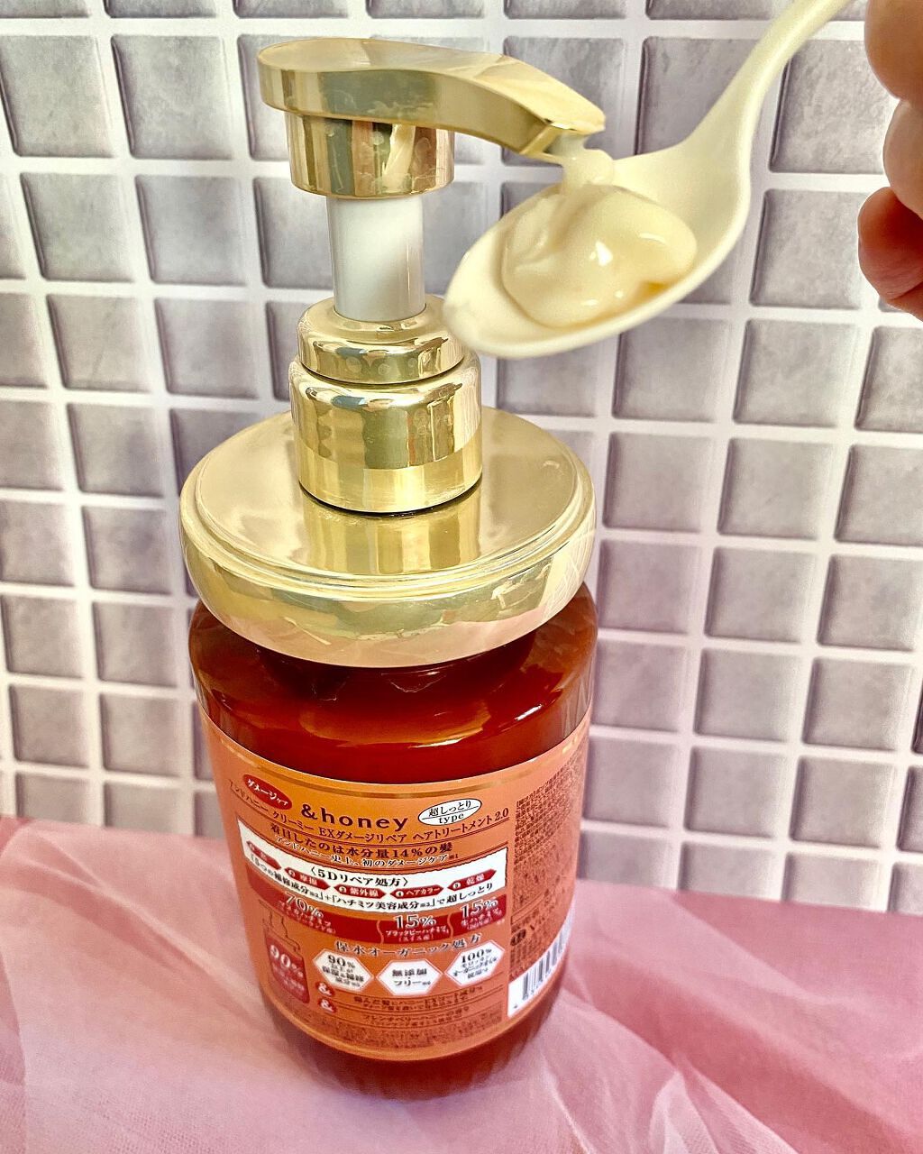 髪の水分量14%に着目し、ダメージを保水力でケアする新ハチミツダメージケアのシャンプー・ヘアトリートメント。製品の90%以上をハチミツや高保湿ヒアルロン酸などの保湿&補修成分で構成。 シャンプーもトリートメントもかなり重ためな質感で洗いあがりも勿論しっとりでした○ 突っ張ったりキシキシすることも無くつるんとまとまる感じでした!!! どちらも450ml入っています! 本来だと500mlは欲しいかもと思うところですがでもそこまでコスパは悪くないです🔥