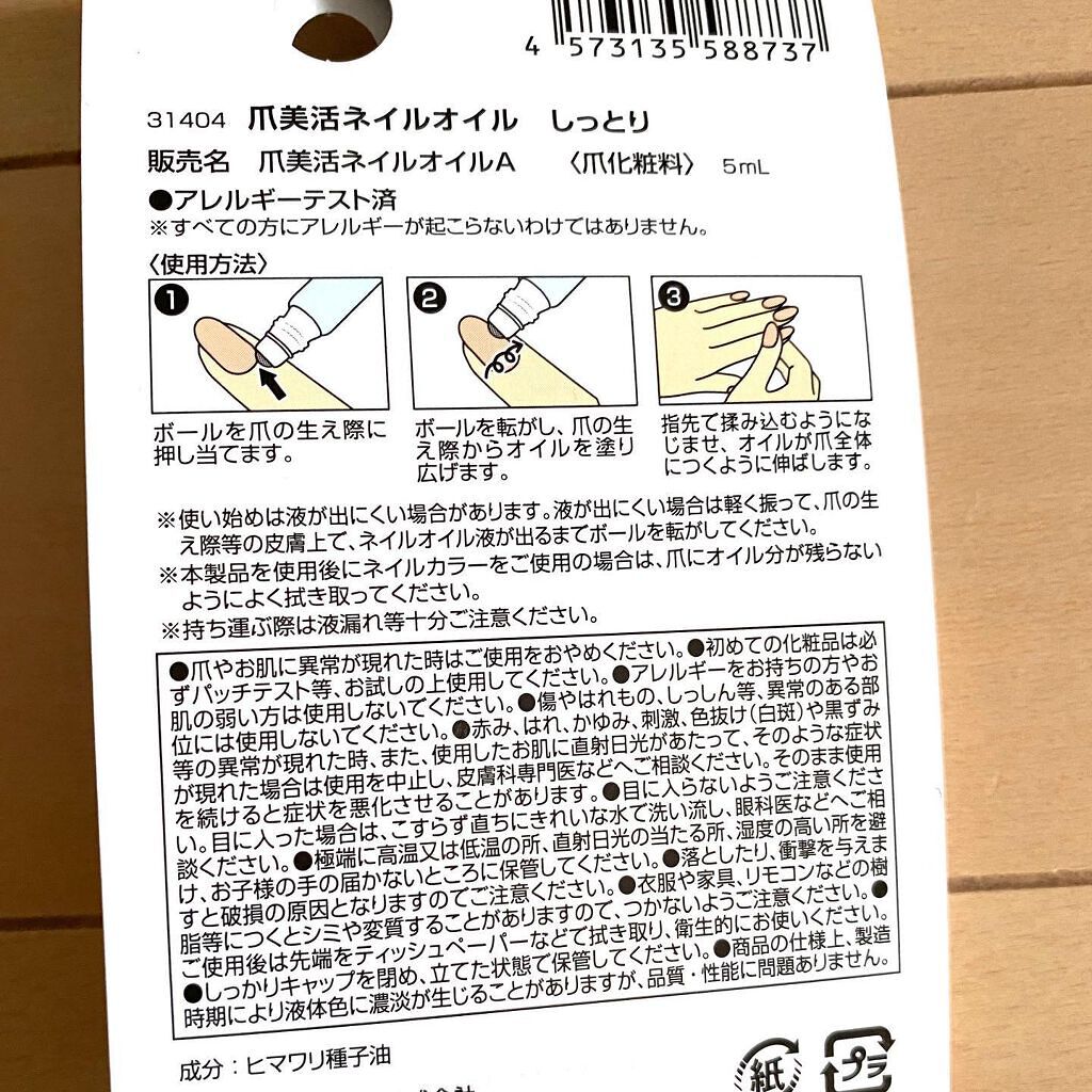 爪にも清潔感、保湿を。爪美活ネイルオイル💅ダイソーにて、110円で購入しました🌻ずっと気になっていた商品です。仕事柄、ネイルはできませんがケアは大事。これならば大丈夫☺︎ガラスの容器に入っているので、取り扱いは少し注意です。かわいい大きさで持...