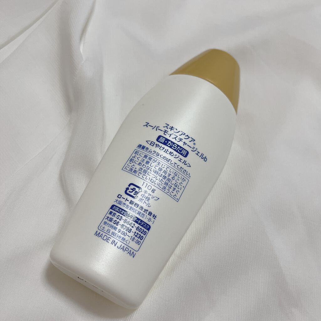 スキンアクアスキンアクアスーパーモイスチャージェル身体用に購入ずっと使い続けているスキンアクア。石鹸で落とせて、SPF50。白い滑らかなジェルがすーっと伸び、ベタつき、きしみ感もなく本当に使いやすいです。塗り直ししてもキシキシしないのも良き。...