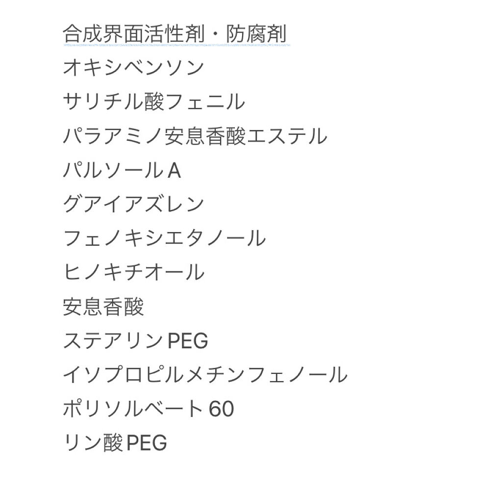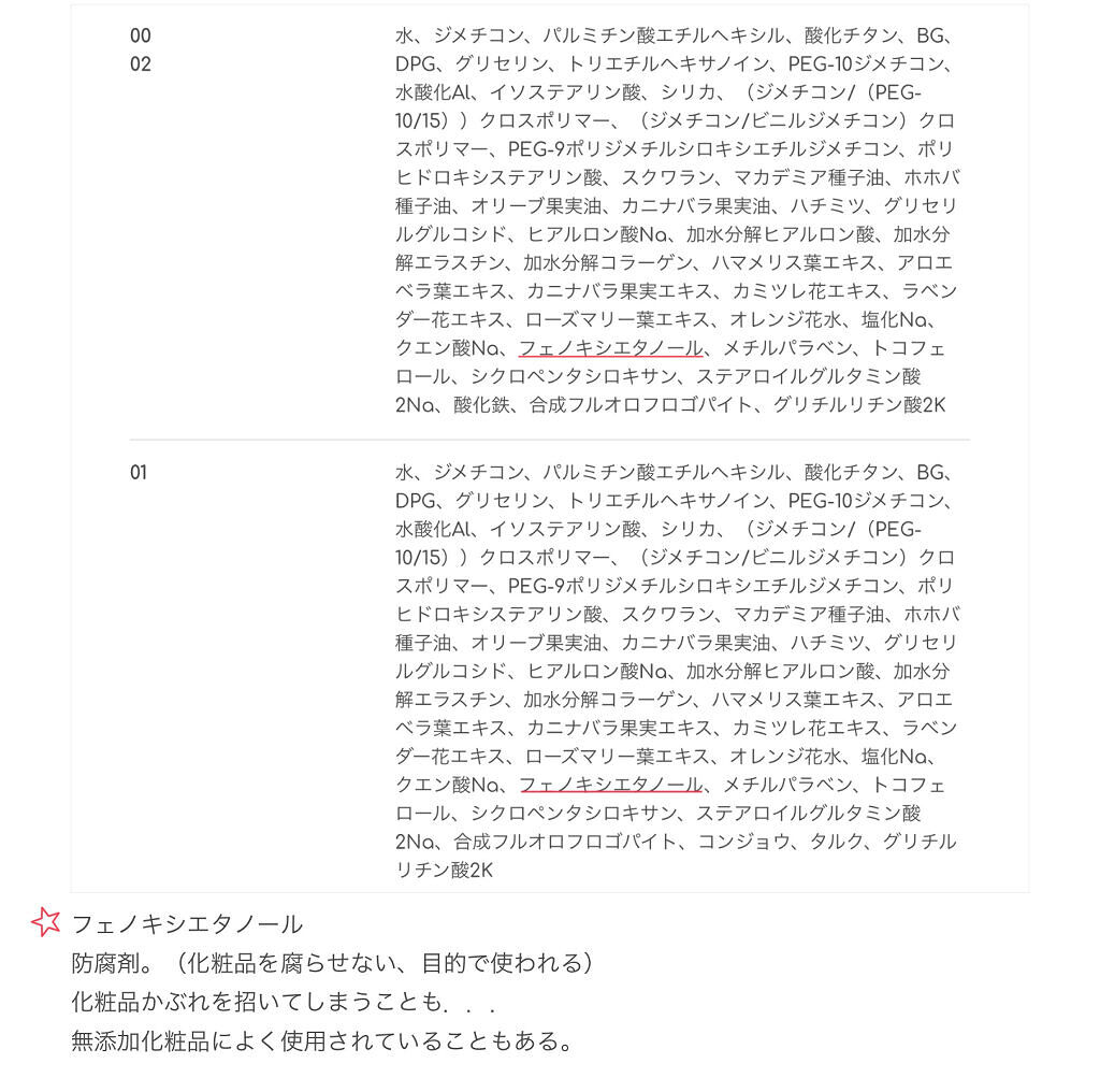 - <00 オレンジベージュ> 水、ジメチコン、パルミチン酸エチルヘキシル、酸化チタン、BG、DPG、グリセリン、トリエチルヘキサノイン、PEG-10ジメチコン、水酸化Al、イソステアリン酸、シリカ、(ジメチコン/(PEG-10/15))クロスポリマー、(ジメチコン/ビニルジメチコン)クロスポリマー、PEG-9ポリジメチルシロキシエチルジメチコン、ポリヒドロキシステアリン酸、スクワラン、マカデミア種子油、ホホバ種子油、オリーブ果実油、カニナバラ果実油、ハチミツ、グリセリルグルコシド、ヒアルロン酸Na、加水分解ヒアルロン酸、加水分解エラスチン、加水分解コラーゲン、ハマメリス葉エキス、アロエベラ葉エキス、カニナバラ果実エキス、カミツレ花エキス、ラベンダー花エキス、ローズマリー葉エキス、オレンジ花水、塩化Na、クエン酸Na、フェノキシエタノール、メチルパラベン、トコフェロール、シクロペンタシロキサン、ステアロイルグルタミン酸2Na、酸化鉄、合成フルオロフロゴパイト、グリチルリチン酸2K <01 ライトブルー> 水、ジメチコン、パルミチン酸エチルヘキシル、酸化チタン、BG、DPG、グリセリン、トリエチルヘキサノイン、PEG-10ジメチコン、水酸化Al、イソステアリン酸、シリカ、(ジメチコン/(PEG-10/15))クロスポリマー、(ジメチコン/ビニルジメチコン)クロスポリマー、PEG-9ポリジメチルシロキシエチルジメチコン、ポリヒドロキシステアリン酸、スクワラン、マカデミア種子油、ホホバ種子油、オリーブ果実油、カニナバラ果実油、ハチミツ、グリセリルグルコシド、ヒアルロン酸Na、加水分解ヒアルロン酸、加水分解エラスチン、加水分解コラーゲン、ハマメリス葉エキス、アロエベラ葉エキス、カニナバラ果実エキス、カミツレ花エキス、ラベンダー花エキス、ローズマリー葉エキス、オレンジ花水、塩化Na、クエン酸Na、フェノキシエタノール、メチルパラベン、トコフェロール、シクロペンタシロキサン、ステアロイルグルタミン酸2Na、合成フルオロフロゴパイト、コンジョウ、タルク、グリチルリチン酸2K <02 ピーチピンク> 水、ジメチコン、パルミチン酸エチルヘキシル、酸化チタン、BG、DPG、グリセリン、トリエチルヘキサノイン、PEG-10ジメチコン、水酸化Al、イソステアリン酸、シリカ、(ジメチコン/(PEG-10/15))クロスポリマー、(ジメチコン/ビニルジメチコン)クロスポリマー、PEG-9ポリジメチルシロキシエチルジメチコン、ポリヒドロキシステアリン酸、スクワラン、マカデミア種子油、ホホバ種子油、オリーブ果実油、カニナバラ果実油、ハチミツ、グリセリルグルコシド、ヒアルロン酸Na、加水分解ヒアルロン酸、加水分解エラスチン、加水分解コラーゲン、ハマメリス葉エキス、アロエベラ葉エキス、カニナバラ果実エキス、カミツレ花エキス、ラベンダー花エキス、ローズマリー葉エキス、オレンジ花水、塩化Na、クエン酸Na、フェノキシエタノール、メチルパラベン、トコフェロール、シクロペンタシロキサン、ステアロイルグルタミン酸2Na、酸化鉄、合成フルオロフロゴパイト、グリチルリチン酸2K