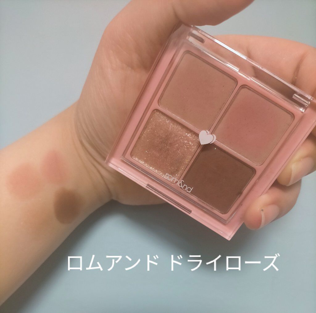 やっぱり安定ロムアンド🌟結局この4色アイシャドウが1番好きです🤦🏻♀️私はドライマンゴーチューリップのコーラルラメが特に大好きでギラギラ過ぎないのにめちゃくちゃ可愛い発色だからここばっかり使っちゃう😂ドライローズのラメもシャンパンゴールドに...