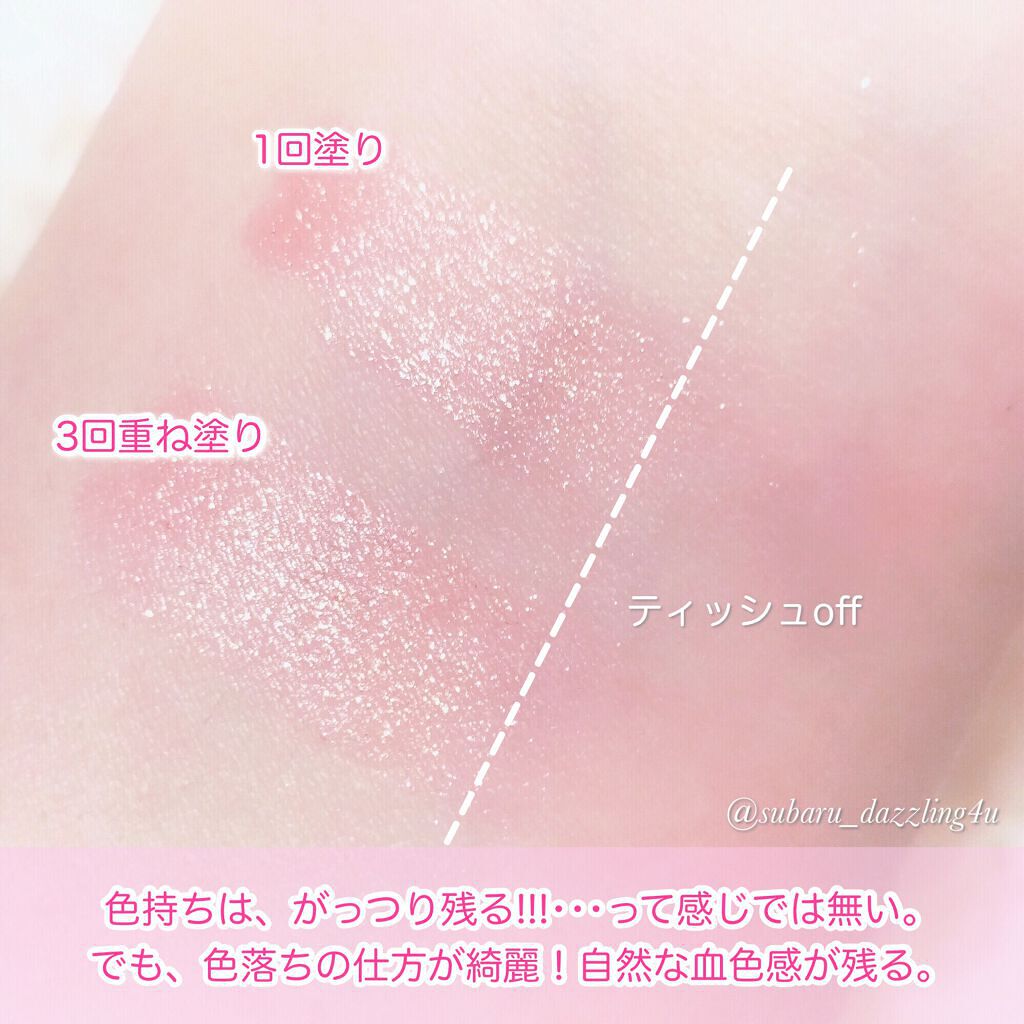⭕良いところ🥰・ティントでは珍しい白みピンク・塗布後は白浮きせず、程よいミルキー感・青みピンクなので透明感があり、ブルベ優勝・色残りも良い ➡︎5分後にoffしても、色味・ツヤ感あり ※3枚目の画像を参照 白みの強いミルキーピンク!ティントには珍しい、絶妙な白み具合で可憐な雰囲気になれます♡ 青みが強いのでブルベさん歓喜カラー✨透明感溢れる、美少女リップが完成👏