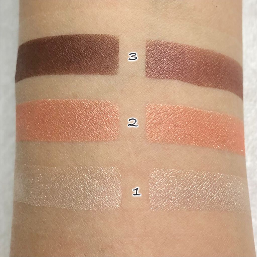 全体的には、名前のとおりヌーディーな印象☺️定番色「01 本命のブラウン」と似てるんだけど、今回の「104 本能のヌードベージュ」の方が、よりヌーディーなカラーとなっておりまする💁🏻♀️ 左上のベージュカラー(1番)は、基本的にはマットカラーなんだけど、ほんのりラメも入ってるから、のっぺりとした印象にならなくて良き🥰 4番のカラーは、ハイライトとして使うこともできるし、個人的には涙袋に使っても良いのではないかと思っておりまする👻 こちらは、全体的にしっとりとしたテクスチャーとなっておりまする💖そして、上2色のマットカラーが、結構しっかり発色してくれます❣️ 右下のハイライトカラーも、「104 本能のヌードベージュ」ほど白っぽくならないので、さりげなくハイライトを入れたい人にピッタリ✨