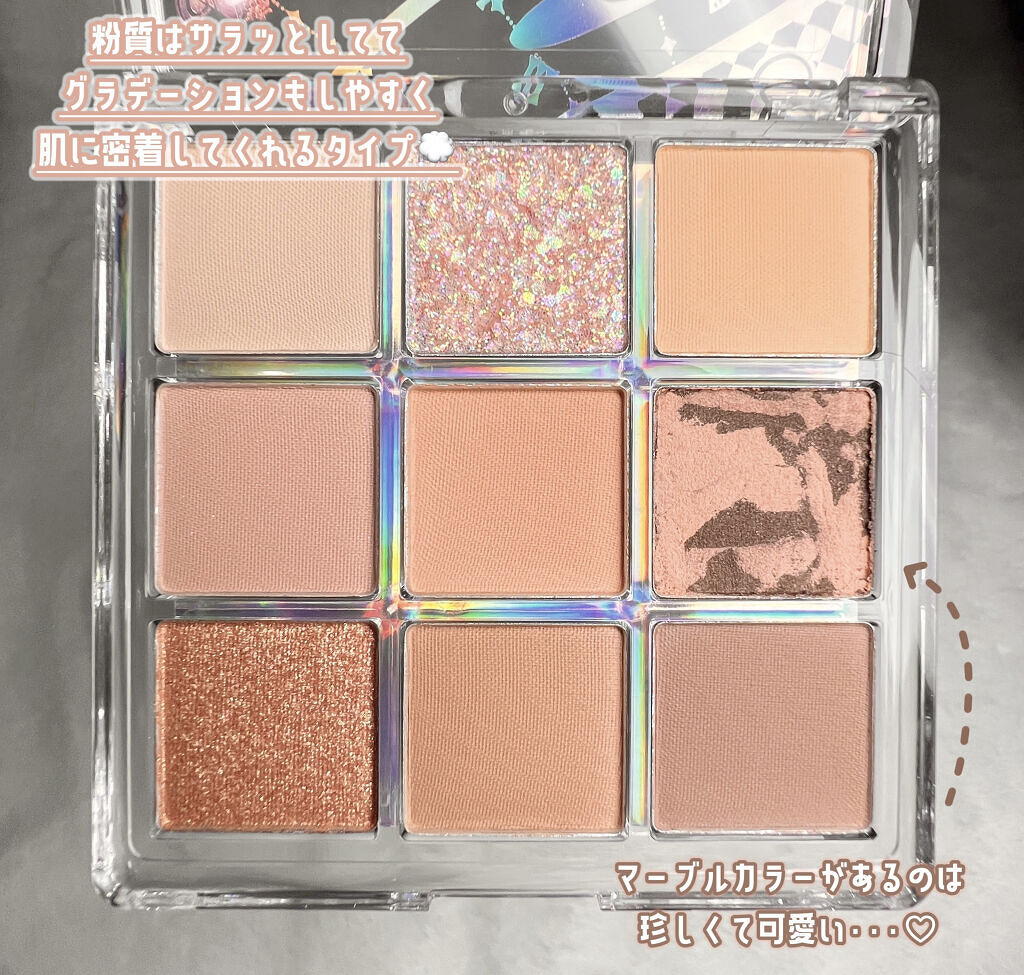 - 雲のような柔らかい質感で密着力が抜群です。 もちふわなテクスチャーで高発色なアイシャドウ。 捨て色なしの9色パレットです。 順番に重ねるだけで 輝きの微細パールで、ギラつかない、大人のツヤ感になります。 しっとりとしたパウダーがしっかりと色づいて粉飛びしにくくピタッと密着します。 *商品サイズ (幅×奥行×高さ) :8.5*8.5*1.5cm