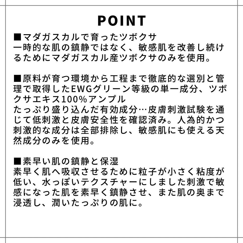 - 太古の自然マダガスカルの自然由来ツボクサエキス*1を100%配合し、乾燥により刺激を受けた肌を整える美容液です。敏感に傾いた肌を素早く整える*2と同時に、乾燥による外部の刺激によって荒れやすい肌をしっとり艶やかに導きます。ベタつかないサラっとしたテクスチャーで、潤いをたっぷりと。 *1ツボクサエキス(保湿成分) *2パッチテスト済み(すべての方に刺激が起きないわけではありません)
