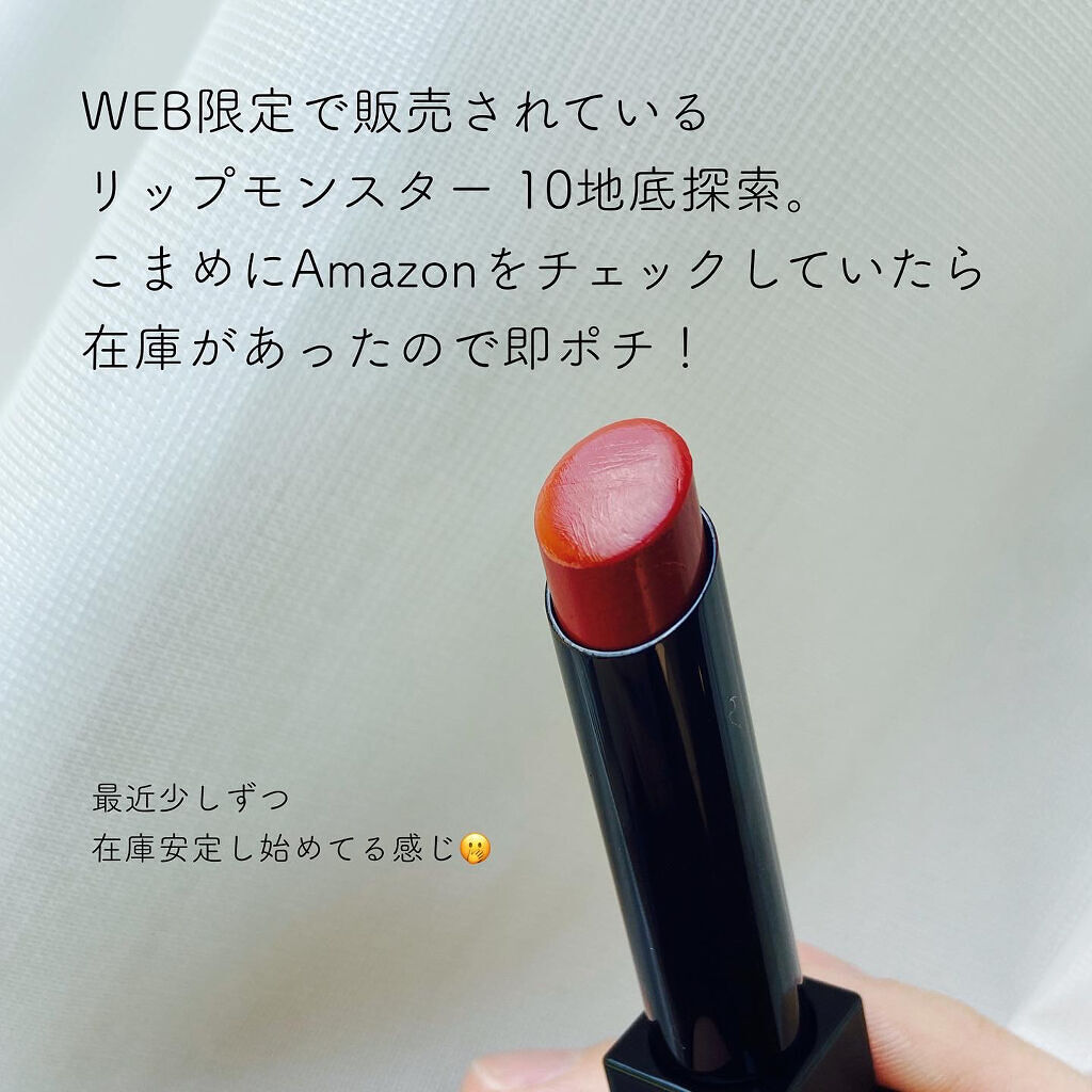 - 落ちにくさも美発色もよくばりたい、つけたての色が長時間持続する人気の口紅リップモンスター。 唇から蒸発する水分を活用して密着ジェル膜に変化する独自技術※で、つけたての色が長時間持続。 高発色&保湿。 ※当社独自の色持ち技術 ■花火のようにまぶしくきらめく 繊細なラメが際立つ限定色 EX-6 ピンクカラー×青ラメ【ロケット花火流星群】 EX-7 オレンジカラー×黄&緑ラメ【100万発の線香花火】 EX-8 レッドカラー×緑ラメ【打ち上げ花火ブランコ】 ■深みレッド系カラーの限定色 EX-9 戦慄の喜笑 (限定色) EX-10 狂気の怒号 (限定色) 【2025クリスマスコフレ】 落ちにくいリップモンスターから、唇の血色感を底上げする ホリデーシーズン限定の熱感ニュアンスベージュ系カラー登場。 EX-11 紅煙宿る贈り物(限定色):ボルドーベージュ系 EX-12 盗まれた1224mの星光(限定色):キャメルベージュ系