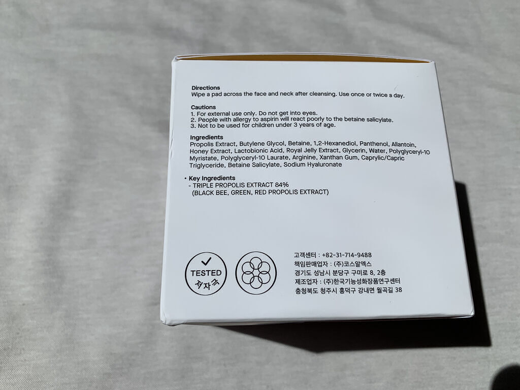 - 1) 3つのプロポリス抽出物84%配合 (フランス産ブラックビプロポリス/ ブラジル産レッドプロポリス/ ブラジル産グリーンプロポリス) 2)ビーガンエンボ生地で拭く時も、貼る時もやさしく使用 エンボス面 – やさしく拭き取る・ 滑らかな面 - 叩いて吸収させる。 <使用方法> 1. 洗顔後のエンボス面で目元を除いた顔全体に肌のキメの方向でやさしく拭きます。 2. パッドをひっくり返して柔らかい面で肌を軽く叩いてエッセンスを吸収させます。 3.使用後にパッドが乾かないように、蓋をしっかり閉めて密封してください。