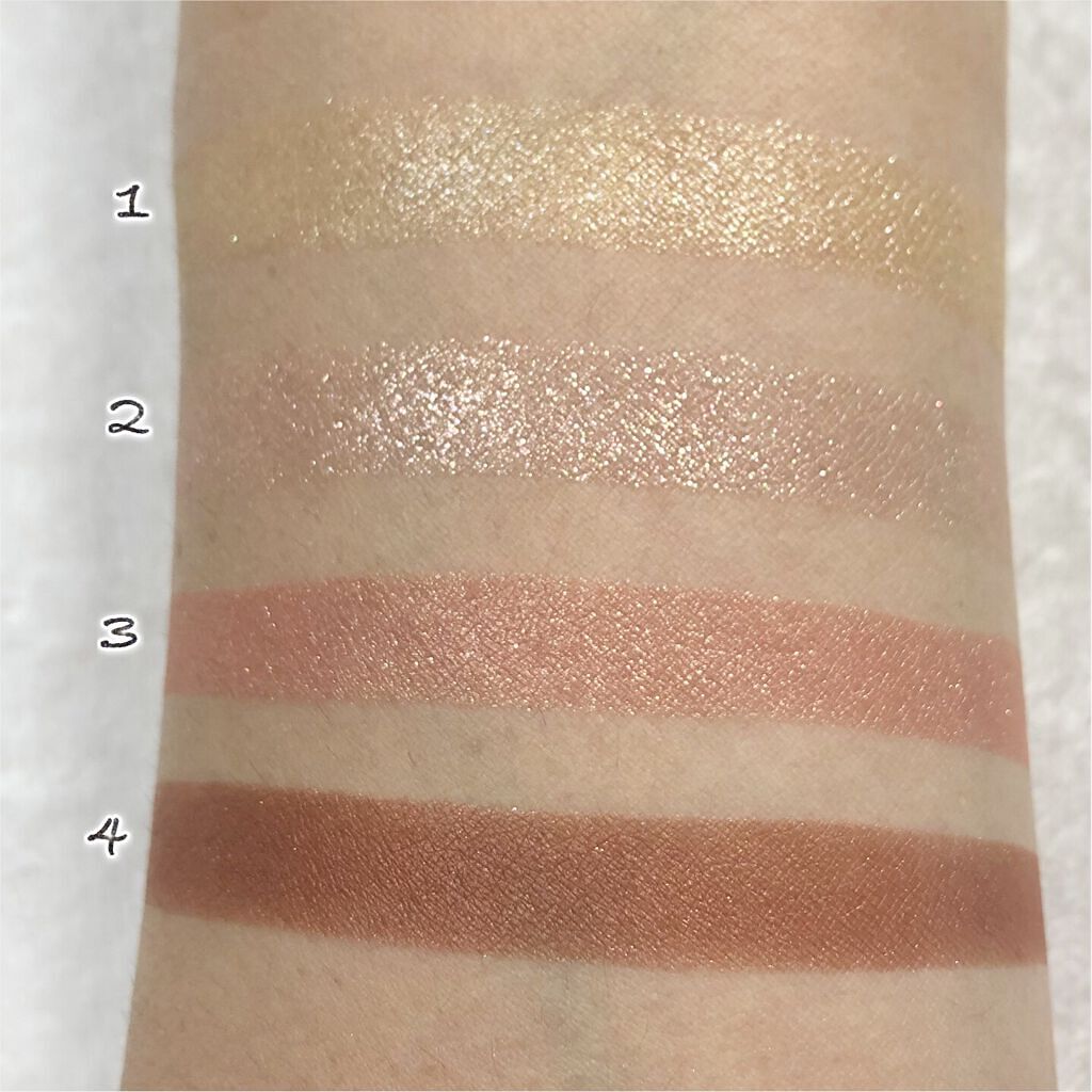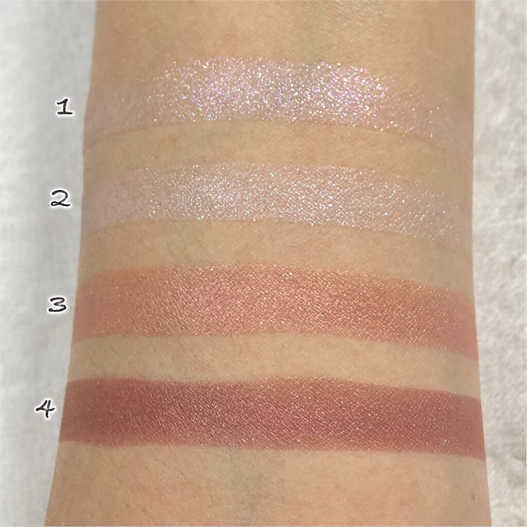 全体的には、名前のとおりヌーディーな印象☺️定番色「01 本命のブラウン」と似てるんだけど、今回の「104 本能のヌードベージュ」の方が、よりヌーディーなカラーとなっておりまする💁🏻♀️ 左上のベージュカラー(1番)は、基本的にはマットカラーなんだけど、ほんのりラメも入ってるから、のっぺりとした印象にならなくて良き🥰 4番のカラーは、ハイライトとして使うこともできるし、個人的には涙袋に使っても良いのではないかと思っておりまする👻 こちらは、全体的にしっとりとしたテクスチャーとなっておりまする💖そして、上2色のマットカラーが、結構しっかり発色してくれます❣️ 右下のハイライトカラーも、「104 本能のヌードベージュ」ほど白っぽくならないので、さりげなくハイライトを入れたい人にピッタリ✨