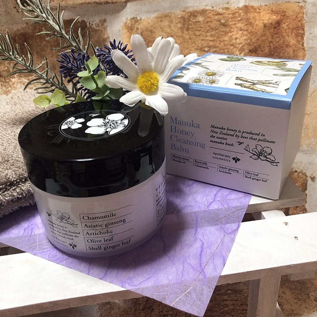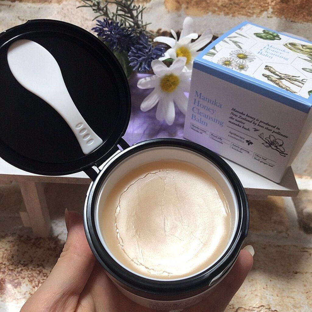 マヌカハニークレンジングバーム🍯.付属のスパチュラでバームを肌にのせて、肌温にとろりととろけるバームは、メイクの上でくるくるするとスルスルメイクと馴染む❤︎.マヌカハニーのおかげか、私は洗い上がりのしっとり感が感じられて満足🫶.抗菌成分を含む...