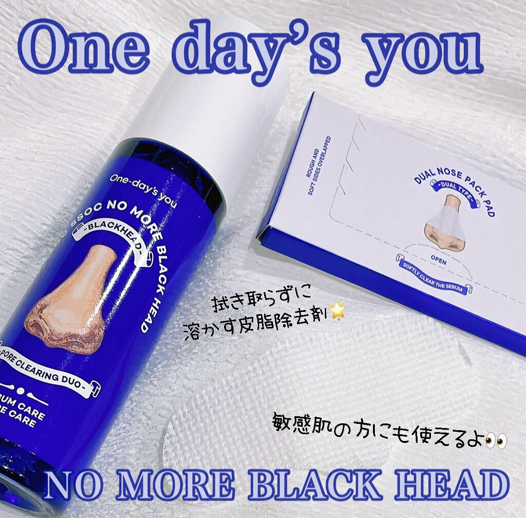 One-day'syouノーモアブラックヘッドQoo10ビューティーランキングでも1位を獲得した鼻パック🩵肌に刺激を与えずに優しく溶かしてくれる毛穴ケアパック🌿サラサラとしたテクスチャーのエッセンスをコットンに染み込ませて、15〜20分ほど置...