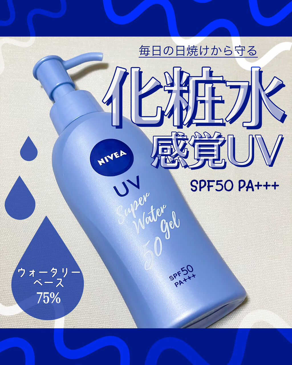 ニベアUVウォータージェル<顔・からだ用>ポンプ 140g ¥1,303〜SPF50/PA+++軽いつけ心地でベタつきにくいウォータリーベース75%のスキンケアUV化粧水と乳液の間くらいのテクスチャー鉱物油フリー・合成香料フリー・合成着色剤フ...