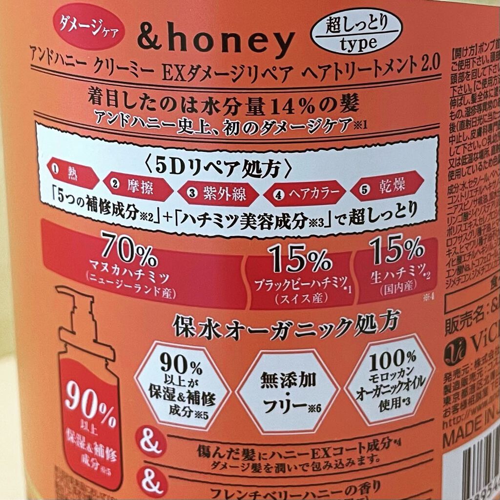 髪の水分量14%に着目し、ダメージを保水力でケアする新ハチミツダメージケアのシャンプー・ヘアトリートメント。製品の90%以上をハチミツや高保湿ヒアルロン酸などの保湿&補修成分で構成。 シャンプーもトリートメントもかなり重ためな質感で洗いあがりも勿論しっとりでした○ 突っ張ったりキシキシすることも無くつるんとまとまる感じでした!!! どちらも450ml入っています! 本来だと500mlは欲しいかもと思うところですがでもそこまでコスパは悪くないです🔥