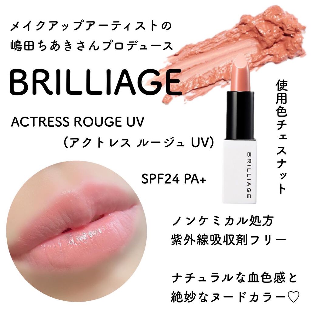 - マスクをはずした瞬間もキレイが叶う!ひと塗りで肌色がワントーンあがる血色カラー ブリリアージュの新色リップは、ポーチに1本しのばせておきたい万能カラー。 ノンケミカル処方に加えて、日常の紫外線もカット。肌映えとケアの両方を実現
