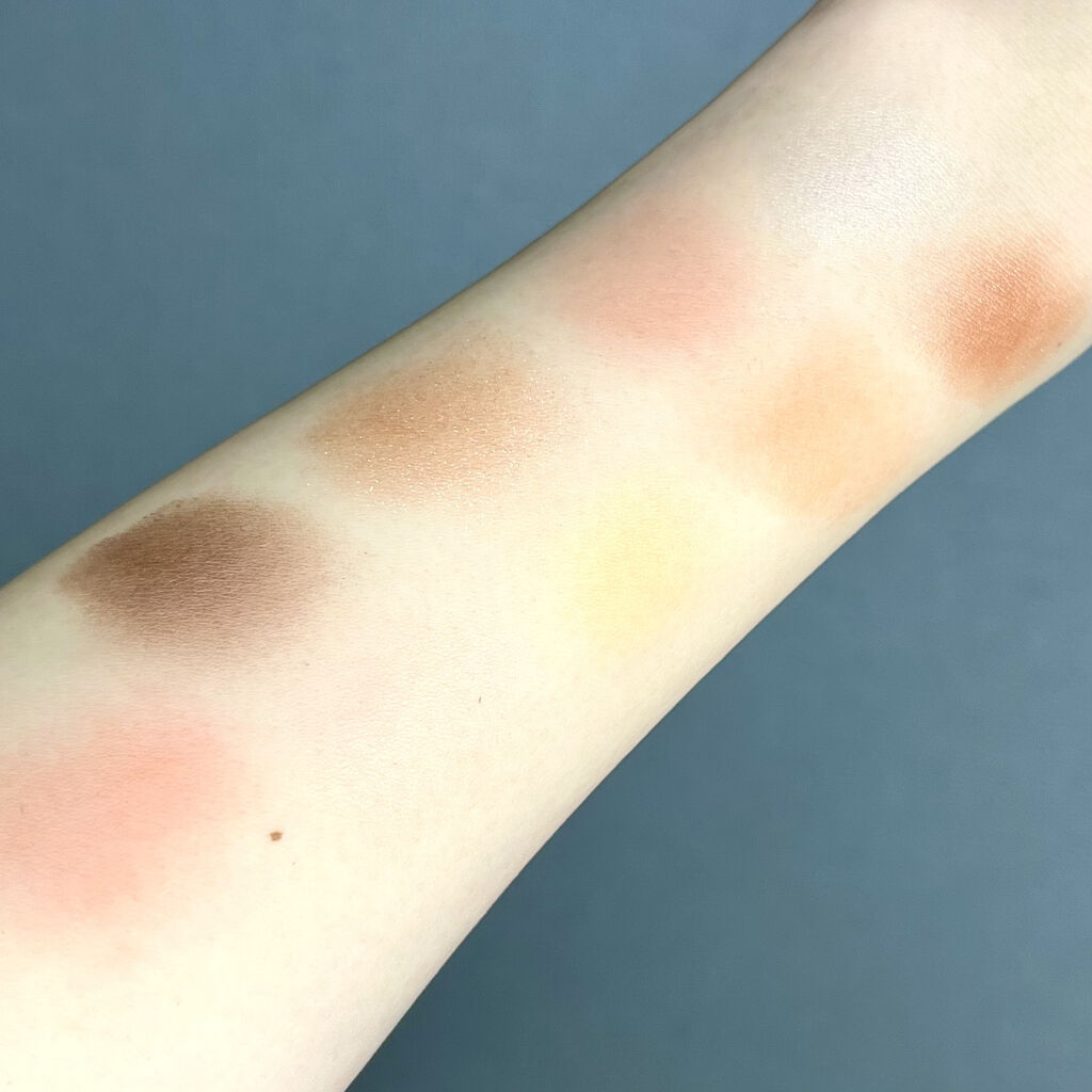 右上のカラーが濃く見えますが、すごく薄めな黄みがかったブラウンなので、締め色というよりはアイホール全体に伸ばすベース色として使用するのがおすすめです🙆♀️ 真っ赤!というよりブラウンよりの赤なので、肌色を選ばず綺麗な落ち着いたピンクメイクができると思います🥰 右上のカラーが1番青みがかっていて、私のように肌が黄色の人は使いづらそうに見えますが、めっちゃくちゃ肌色と馴染みが良くて全く浮きません!