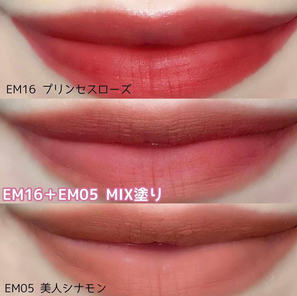 - <EM-J01 ピンクミスト> ジメチコン、ジメチコンクロスポリマー、トリベヘニン、リンゴ酸ジイソステアリル、(ビニルジメチコン/メチコンシルセスキオキサン)クロスポリマー、酸化チタン、セチルPEG/PPG-10/1ジメチコン、イソステアリン酸ソルビタン、(VP/ヘキサデセン)コポリマー、トリイソステアリン酸ポリグリセリル-2、ジイソステアリン酸ポリグリセリル-2、赤230(1)、赤202、黄4、香料、デヒドロ酢酸、酸化鉄 <EM-J02 ベルベットムード > ジメチコン、ジメチコンクロスポリマー、トリベヘニン、リンゴ酸ジイソステアリル、酸化チタン、(ビニルジメチコン/メチコンシルセスキオキサン)クロスポリマー、セチルPEG/PPG-10/1ジメチコン、イソステアリン酸ソルビタン、(VP/ヘキサデセン)コポリマー、トリイソステアリン酸ポリグリセリル-2、酸化鉄、赤202、ジイソステアリン酸ポリグリセリル-2香料、ジメチルシリル化シリカ、デヒドロ酢酸、黄4、黄5 <EM01 ポップスターブリック> ジメチコン、ジメチコンクロスポリマー、トリベヘニン、トリイソステアリン酸ポリグリセリル-2、酸化鉄、(ビニルジメチコン/メチコンシルセスキオキサン)クロスポリマー、セチルPEG/PPG-10/1ジメチコン、イソステアリン酸ソルビタン、(VP/ヘキサデセン)コポリマー、黄5、リンゴ酸ジイソステアリル、赤202、ジイソステアリン酸ポリグリセリル-2、香料、デヒドロ酢酸、水添ロジン酸メチル <EM03 モデルテラコッタ> ジメチコン、ジメチコンクロスポリマー、トリイソステアリン酸ポリグリセリル-2、トリベヘニン、黄4、酸化鉄、(ビニルジメチコン/メチコンシルセスキオキサン)クロスポリマー、セチルジメチコンコポリオール、イソステアリン酸ソルビタン、(VP/ヘキサデセン)コポリマー、リンゴ酸ジイソステアリル、香料、デヒドロ酢酸、水添ロジン酸メチル <EM05 美人シナモン> ジメチコン、ジメチコンクロスポリマー、トリベヘニン、リンゴ酸ジイソステアリル、酸化チタン、酸化鉄、トリイソステアリン酸ポリグリセリル-2、(ビニルジメチコン/メチコンシルセスキオキサン)クロスポリマー、セチルジメチコンコポリオール、イソステアリン酸ソルビタン、(VP/ヘキサデセン)コポリマー、香料、赤202、ジイソステアリン酸ポリグリセリル-2、デヒドロ酢酸、水添ロジン酸メチル <EM07 ファッショニスタココア> ジメチコン、ジメチコンクロスポリマー、トリイソステアリン酸ポリグリセリル-2、トリベヘニン、赤227、(ビニルジメチコン/メチコンシルセスキオキサン)クロスポリマー、酸化鉄、セチルジメチコンコポリオール、イソステアリン酸ソルビタン、(VP/ヘキサデセン)コポリマー、黄5、リンゴ酸ジイソステアリル、香料、デヒドロ酢酸、水添ロジン酸メチル <EM08 インフルエンサーモカ> ジメチコン、ジメチコンクロスポリマー、トリベヘニン、トリイソステアリン酸ポリグリセリル-2、(ビニルジメチコン/メチコンシルセスキオキサン)クロスポリマー、リンゴ酸ジイソステアリル、酸化鉄、酸化チタン、セチルジメチコンコポリオール、イソステアリン酸ソルビタン、(VP/ヘキサデセン)コポリマー、黄5、赤202、ジイソステアリン酸ポリグリセリル-2、香料、デヒドロ酢酸、水添ロジン酸メチル <EM09 セレブブラウン> ジメチコン、ジメチコンクロスポリマー、トリベヘニン、リンゴ酸ジイソステアリル、酸化鉄、酸化チタン、トリイソステアリン酸ポリグリセリル-2、(ビニルジメチコン/メチコンシルセスキオキサン)クロスポリマー、セチルジメチコンコポリオール、イソステアリン酸ソルビタン、(VP/ヘキサデセン)コポリマー、香料、赤202、ジイソステアリン酸ポリグリセリル-2、デヒドロ酢酸、水添ロジン酸メチル <EM10 クイーンローズティー> ジメチコン、ジメチコンクロスポリマー、トリベヘニン、トリイソステアリン酸ポリグリセリル-2、(ビニルジメチコン/メチコンシルセスキオキサン)クロスポリマー、リンゴ酸ジイソステアリル、酸化チタン、酸化鉄、セチルジメチコンコポリオール、イソステアリン酸ソルビタン、(VP/ヘキサデセン)コポリマー、赤227、香料、デヒドロ酢酸、水添ロジン酸メチル <EM11 アーティストモーヴ> ジメチコン、ジメチコンクロスポリマー、トリベヘニン、リンゴ酸ジイソステアリル、(ビニルジメチコン/メチコンシルセスキオキサン)クロスポリマー、酸化チタン、トリイソステアリン酸ポリグリセリル-2、酸化鉄、セチルジメチコンコポリオール、イソステアリン酸ソルビタン、(VP/ヘキサデセン)コポリマー、黄5、赤202、ジイソステアリン酸ポリグリセリル-2、香料、デヒドロ酢酸、水添ロジン酸メチル <EM12 高嶺の花コーラル> ジメチコン、ジメチコンクロスポリマー、トリベヘニン、リンゴ酸ジイソステアリル、酸化チタン、(ビニルジメチコン/メチコンシルセスキオキサン)クロスポリマー、トリイソステアリン酸ポリグリセリル-2、セチルジメチコンコポリオール、イソステアリン酸ソルビタン、(VP/ヘキサデセン)コポリマー、黄4