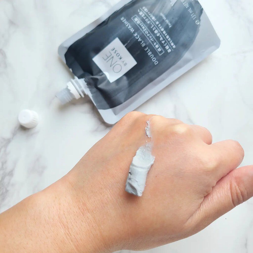 ONEBYKOSEダブルブラックウォッシャー140g泥みたいなテクスチャの洗顔料を肌に塗る洗顔料普通の洗顔に使っても肌のくすみが消えるパック中はピンッとした使用で違和感あるけど洗い流すと物凄くさっぱりして気持ちがいい#暑さを乗り切る夏美容...