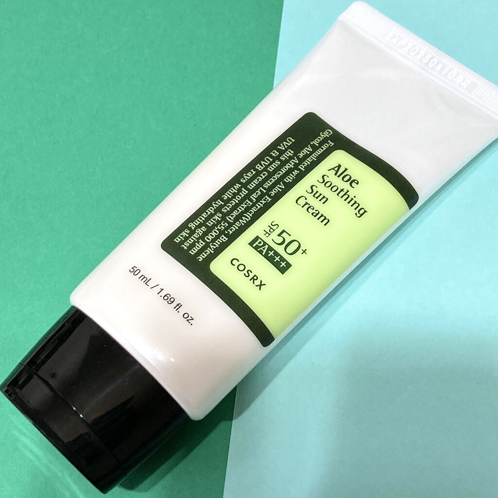 ⭐️⭐️⭐️⭐️☆白浮きしにくい日焼け止め💚COSRXアロエスージングUVクリームSPF50+ PA+++白色のクリーム紫外線吸収剤と散乱剤のハイブリッドタイプアロエイメージの香りつき⚠️瓜っぽい香りなので苦手な方は注意なめらかに伸びます白浮...