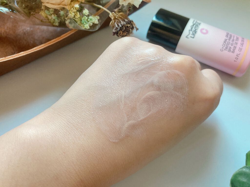 保湿感・ツヤ感・密着感◎ 【M・A・C/ライトフル C+ティンティッド プライマーSPF45】 緩めのテクスチャーで伸びが良いです◎ SPF45/PA+++++で紫外線対策もできてオススメ👾 保湿感があり、乾燥を感じにくくてお気に入り🫶🏻 ツヤ感が出て綺麗な仕上がりイメージ