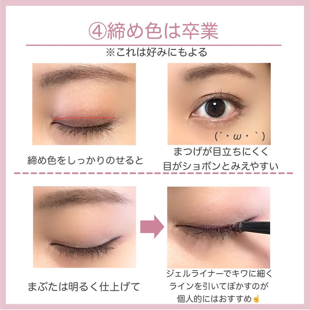 締め色を広くのせる アイシャドウの暗めの色を幅広くのせると まつげが目立ちにくくなってしまう💧 締め色は正面から見た時に まつげの先端よりも狭い範囲にしよう🙆♀️ 眉が明るすぎる 垢抜けには眉を明るく!とよく言うけど 明るくしすぎると悪目立ちして 目のインパクトが弱くなるよ⚠️ バランスが大事☝️ コンシーラーをキワまで塗る 陰影を出してくれる涙袋や まつげのキワまで塗ってしまうと 目がキュッと小粒にみえるよ🙅♀️ コンシーラーは涙袋より下に!