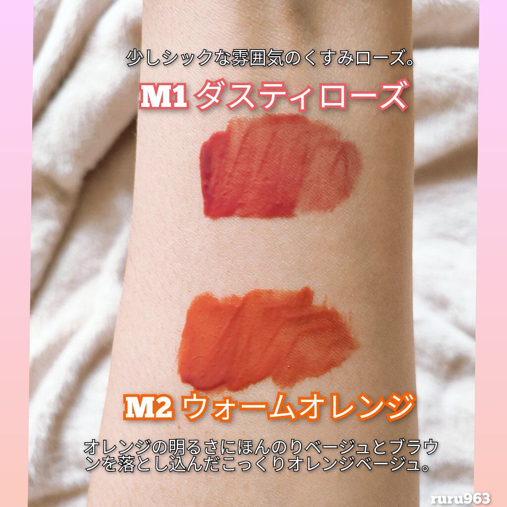 - <M1 ダスティローズ> 水、シリカ、ジフェニルシロキシフェニルトリメチコン、エタノール、ラウロイルグルタミン酸ジ(フィトステリル/オクチルドデシル)、BG、ジフェニルジメチコン、セテス-10、グリセリン、ジカプリン酸ネオペンチルグリコール、オクチルドデカノール、セチルPEG/PPG-10/1ジメチコン、ダイマージリノール酸(フィトステリル/イソステアリル/セチル/ステアリル/ベヘニル)、ダイマージリノール酸ダイマージリノレイル、(アクリル酸ヒドロキシエチル/アクリロイルジメチルタウリンNa)コポリマー、イソヘキサデカン、フェノキシエタノール、メチルパラベン、ポリソルベート60、トコフェロール、エチルパラベン、デヒドロ酢酸Na、リン酸2Na、リン酸Na、シメチコン、スクワラン、ハチミツ、ステアリン酸ソルビタン、ステアリン酸グリセリル、ローヤルゼリーエキス、オレイン酸ポリグリセリル-10、ヒアルロン酸Na、セルロースガム、ローズマリー葉エキス、カミツレ花エキス、水溶性コラーゲン、トリイソステアリン酸ポリグリセリル-2、酸化チタン、酸化鉄、黄4、赤227、水酸化Al、PVP、ポリアスパラギン酸Na、青1、キサンタンガム、EDTA-2Na <M2 ウォームオレンジ> 水、シリカ、ジフェニルシロキシフェニルトリメチコン、エタノール、ラウロイルグルタミン酸ジ(フィトステリル/オクチルドデシル)、BG、ジフェニルジメチコン、セテス-10、グリセリン、ジカプリン酸ネオペンチルグリコール、オクチルドデカノール、セチルPEG/PPG-10/1ジメチコン、ダイマージリノール酸(フィトステリル/イソステアリル/セチル/ステアリル/ベヘニル)、ダイマージリノール酸ダイマージリノレイル、(アクリル酸ヒドロキシエチル/アクリロイルジメチルタウリンNa)コポリマー、イソヘキサデカン、フェノキシエタノール、メチルパラベン、ポリソルベート60、トコフェロール、エチルパラベン、デヒドロ酢酸Na、リン酸2Na、リン酸Na、シメチコン、スクワラン、ハチミツ、ステアリン酸ソルビタン、ステアリン酸グリセリル、ローヤルゼリーエキス、オレイン酸ポリグリセリル-10、ヒアルロン酸Na、セルロースガム、ローズマリー葉エキス、カミツレ花エキス、水溶性コラーゲン、トリイソステアリン酸ポリグリセリル-2、酸化チタン、酸化鉄、黄4、赤227、水酸化Al、PVP、ポリアスパラギン酸Na、青1、キサンタンガム、EDTA-2Na
