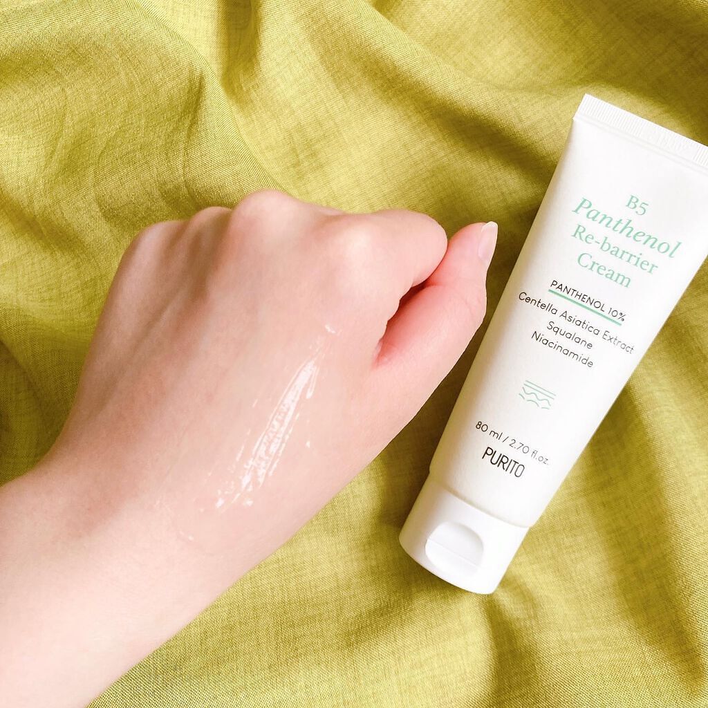 使いきり!PURITOのB5パンテノールリバリアクリーム。お肌にぴたっとすーっとなテクスチャでみずみずしいのにベタつかない、さっぱりめ。パンテノール配合で肌に浸透しやすく、保湿力に優れ肌の水分が蒸発するのを防ぎ、水分保持もできるので肌のバリア...