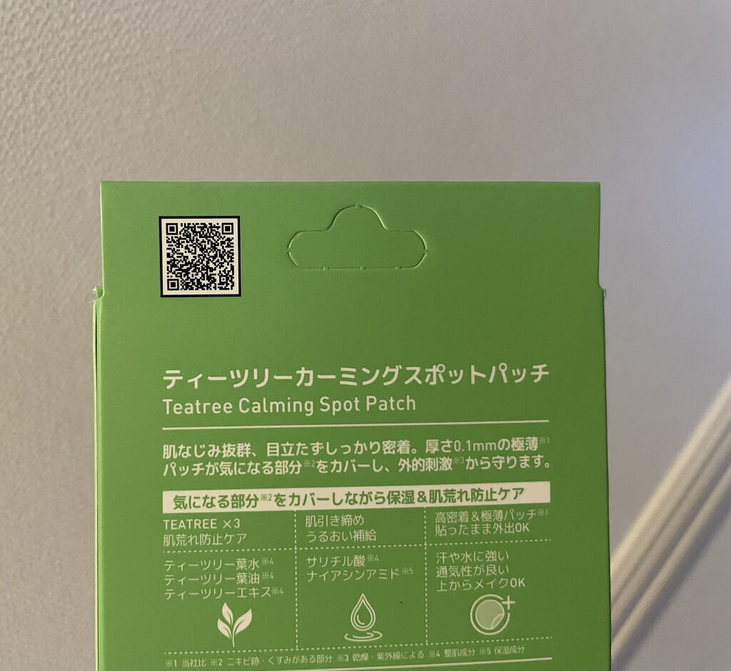 - <ティーツリーカーミングスポットパッチ> アクリレーツコポリマー、サリチル酸、ティーツリー葉油、ティーツリーエキス、ティーツリー葉水、ナイアシンアミド、1,2-ヘキサンジオール