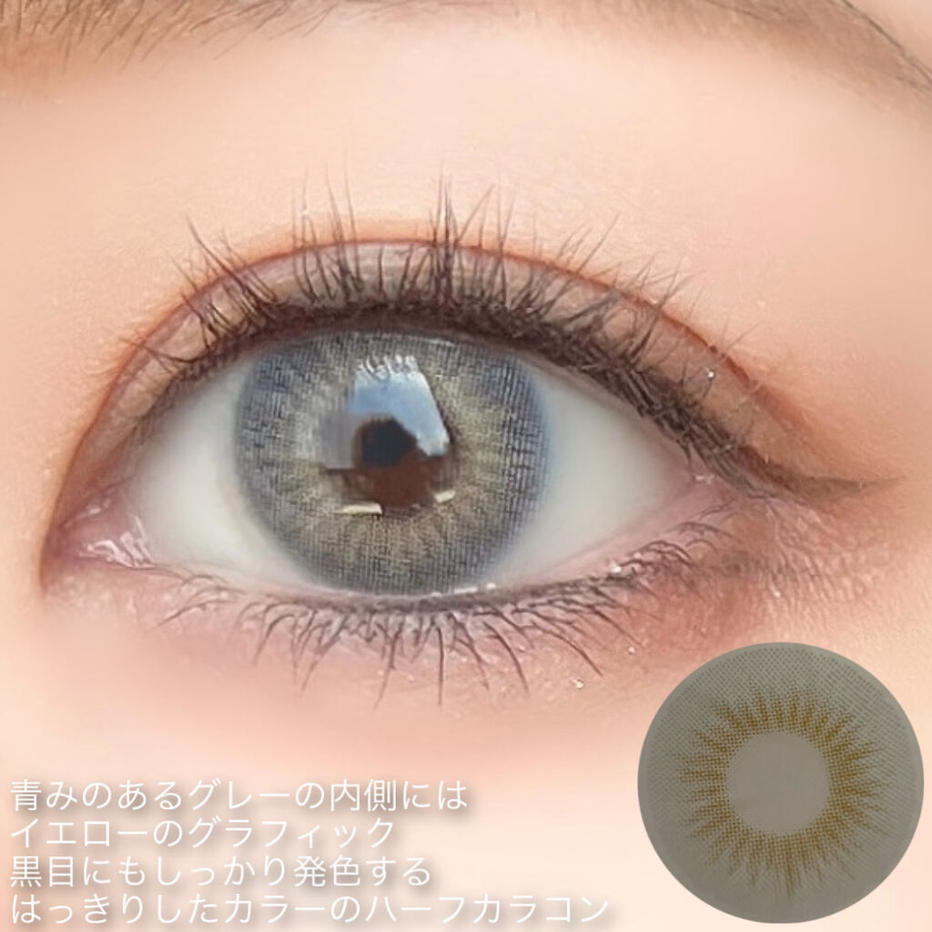 個性的なカラーからナチュラルなものまで幅広いラインナップで見てて楽しかったです! 透明感のあるブルーグレーが瞳に溶け込み、リアルなグレーアイに見せるレンズ。 透け感のある色味だけどしっかり発色するナチュラルハーフ系カラコン。着色直径も小さめなので着せ替え感があってかわいい。 N's COLLECTIONはレンズのつけ心地もすごく良くて他のカラーもとっても可愛いです!