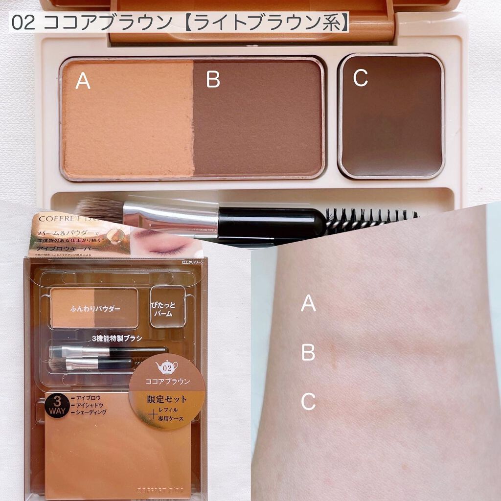 - ぴたっとバームとふんわりパウダーで眉の毛流れ、立体感のある仕上がり※、続くシェーディングやアイシャドウにも使えるアイブロウパレット ※色の陰影によるメイクアップ効果による ぴたっと密着バーム&ふんわり定着パウダーの合わせ使いで、汗・マスク着用時の蒸気にも対応し、毛が生えていない部分も消えにくい、ウォータープルーフタイプ。 ● バームとパウダーの質感の使い分けで、より精密な毛流れや影を表現。 ● シェーディングやアイシャドウまで、顔中使えるマルチタイプ。 ● 使い心地にもこだわった特製ブラシ付き。 コフレドール アイブロウキーパー 全4 種 3.0g こちらの商品は詰め替え用〈レフィル〉です。別売りのアイブロウキーパー用ケースにセットしてお使いください。 アイブロウキーパー用ケース1種(税込770円 ※編集部調べ) 01メルティブラウン(ライトブラウン系) 02ココアブラウン(ブラウン系) 03アッシュピンク(ピンク系) 04ハスキーグレー(グレー系) <数量限定:初回限定版> シェーディングやアイシャドウにも使えるマルチタイプで、絶妙なニュアンスカラーを揃えたウォータープルーフタイプのアイブロウパレットのレフィルにケースがついた便利なセット。 セット内容 コフレドール アイブロウキーパー3.0ℊ(現品) コフレドール アイブロウキーパー用ケース(現品)
