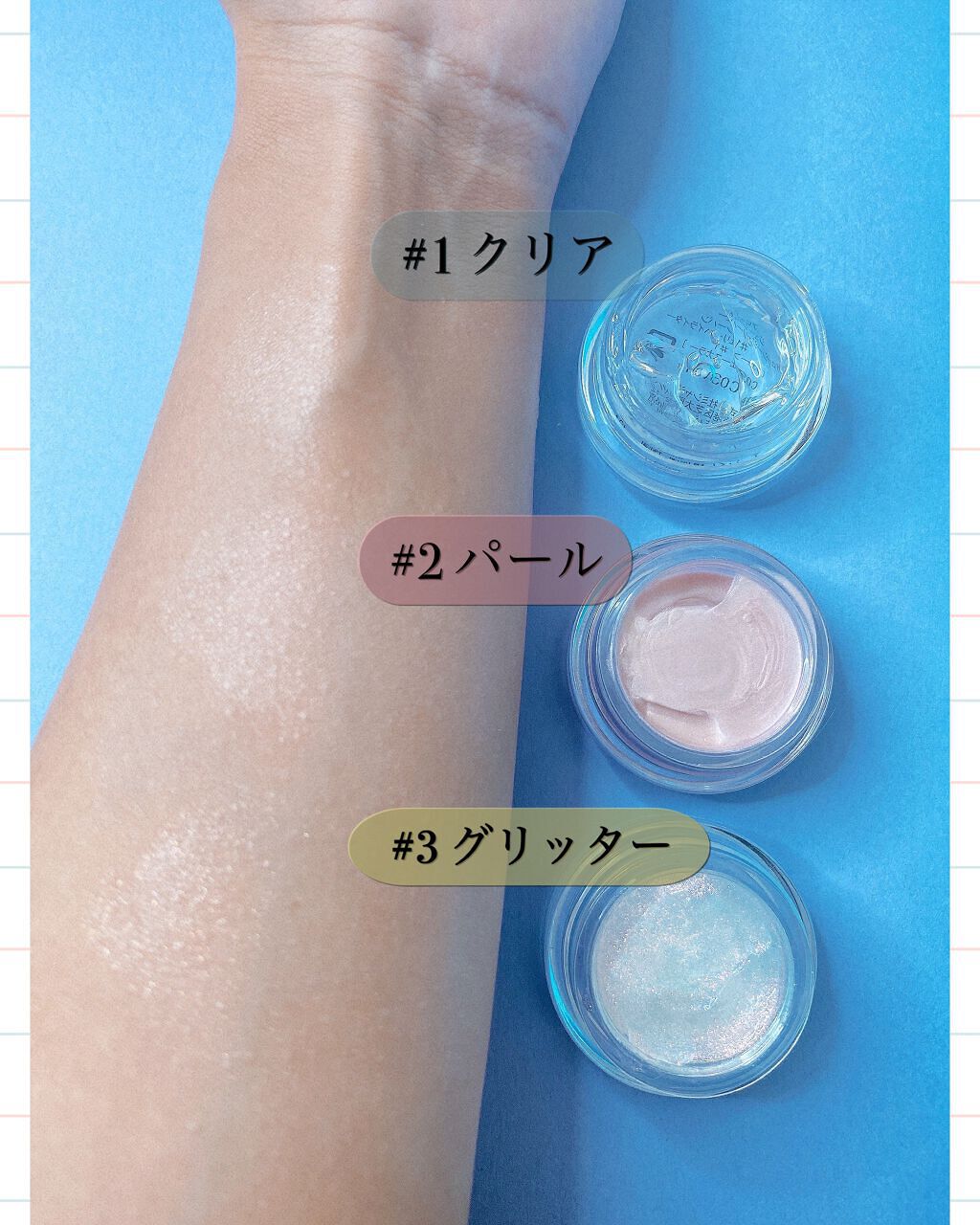 VI01 ミルクラベンダー ピンクラベンダーパール入り。 青み寄りなブルベさんの方が得意そうな色味。 BR01 ローズウッディー ゴールドパール入り。 落ち着いた色味だけど、ゴールドパールで華やかに。 夏のメイクで映えそう✨ グリグリーっと直塗りするより 指に付けてからちょんちょんって 乗せていく方が良さそう👀