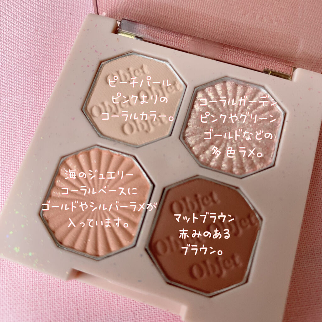 肌馴染みの良いコーラルカラー、締め色が赤みのあるブラウンなので可愛くなり過ぎず、しっかり目元をまとめてくれます◎ ヌーディーなカラーと締め色カラーはマット、メインカラーはほんのりラメ、プラスで楽しめるラメと捨て色なしの4色パレット🎨 爽やかさあふれる肌なじみのよいコーラルで可憐な印象に。