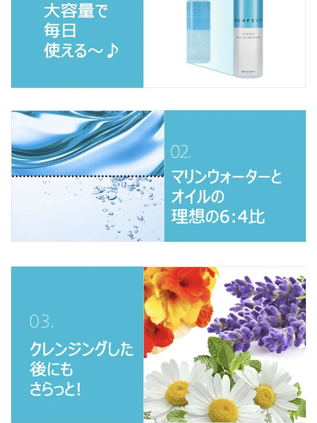 - マスカラやティントなどのしっかりメイクをスルリとOFF クレンジングパーフェクト宣言! ポイントメイク専用 リップ&アイリムーバー 01.容量アップ!お気軽に毎日たっぷりと。 リニューアル前商品に比べて55%増量で、每日気軽にお使いいただけます。 02.水分とオイルが理想的な6:4のバランスで配合! 水分豊富なマリンウォーターとオイルが、理想とされる6:4のバランスで構成され簡単で素早いクレンジングをサポートします。 03.クレンジングの後もすっきりと ヤグルマギクの花の抽出物、タカサブロウ抽出物、ルリジサ抽出物がデリケートな目元や口元にやさしく働きかけ。すっきりとした仕上がりです。