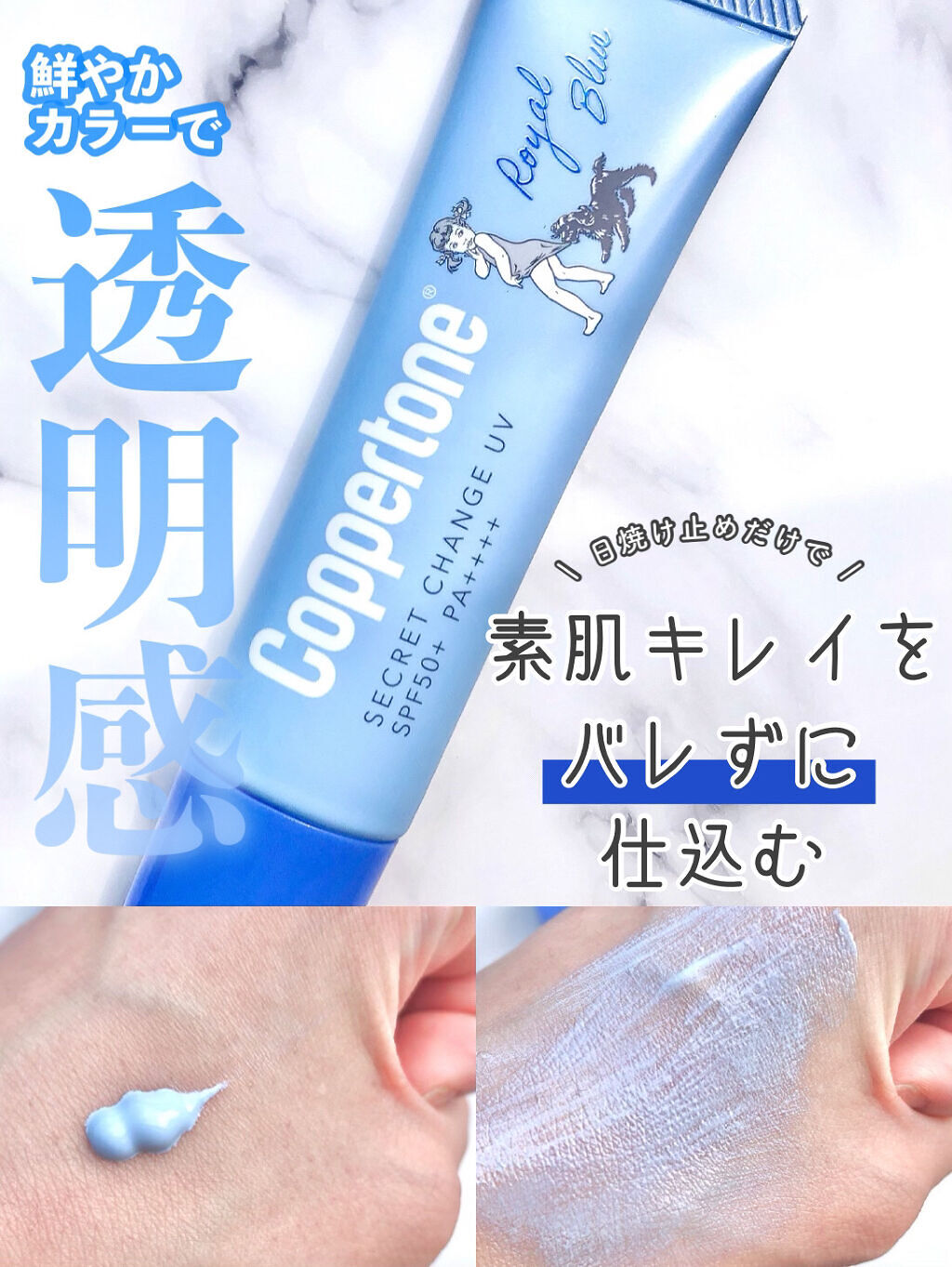 - 素肌キレイをバレずに仕込む♡ コパトーン シークレットチェンジUV 「コパトーン シークレットチェンジUV ロイヤルブルー」は、 ブルーカラーの色補正効果で透明感をプラス。 透きとおるように澄んだ印象の肌へナチュラルにトーンアップ※が叶う日焼け止めジェルです。 ●SPF50+/PA++++ ●汗や水に強いウォータープルーフ。石けんや洗顔料で簡単に落とせます。 ●もっと明るさが欲しい部分には重ね塗りもおススメ。 ●アレルギーテスト・パッチテスト済み(すべての方に皮膚刺激・アレルギーが起こらないというわけではありません。) ※メイク効果による
