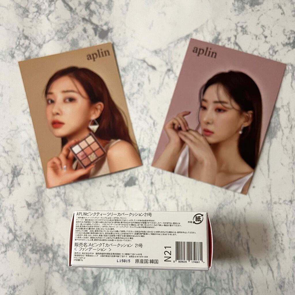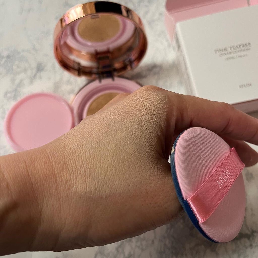 APLIN ピンクティーツリーカバークッション 21号ライトベージュ 2,490円(税込) 少量でよく伸びてハイカバー! 赤みやくすみをしっかりカバ一できるのに、厚塗り感のないなめらかな仕上がり♡ ハイカバーなのにナチュラルなツヤ感とサラッとしつつ、乾燥崩れしにくい仕上がりに感動します!!