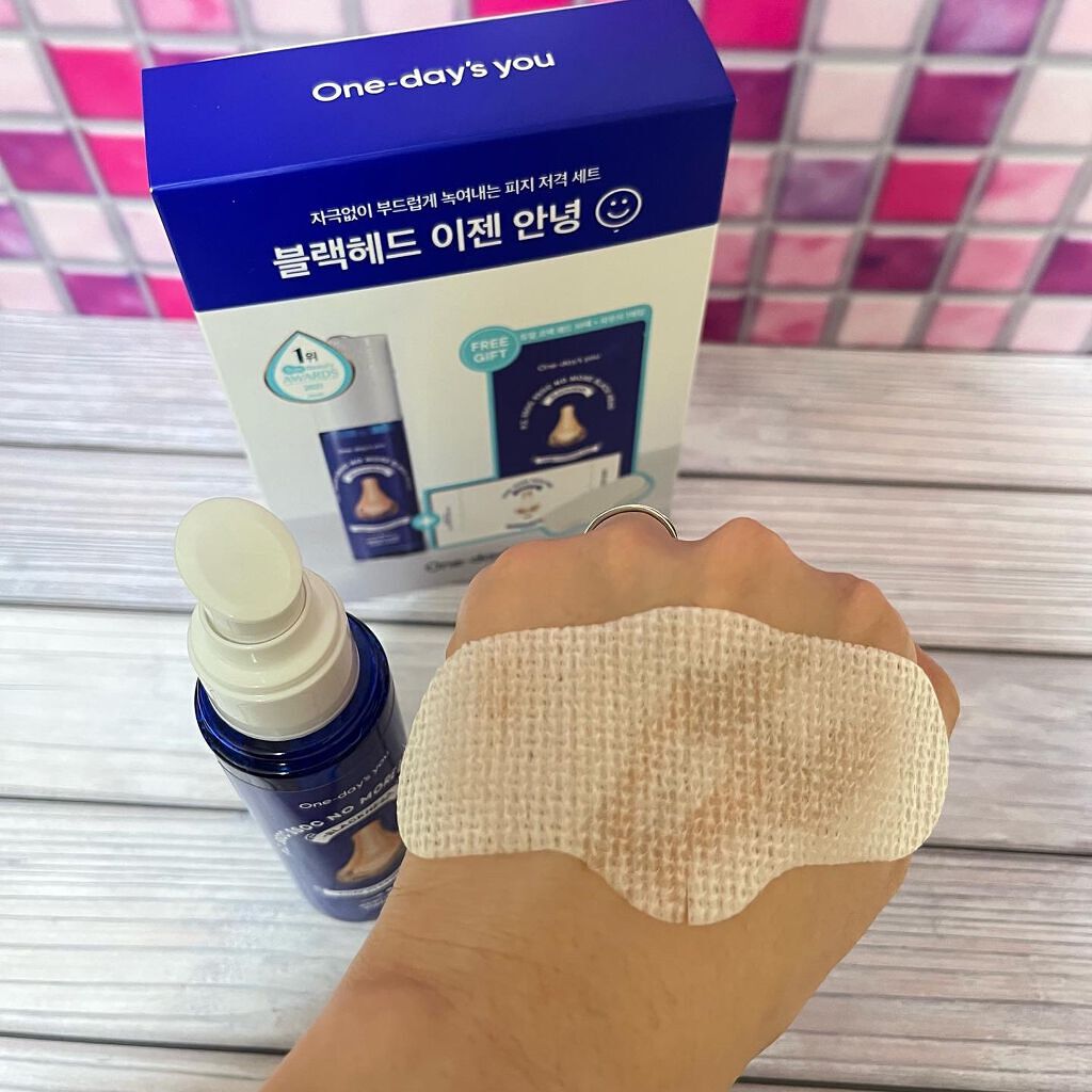 One-day'syouノーモアブラックヘッドQoo10ビューティーランキングでも1位を獲得した鼻パック🩵肌に刺激を与えずに優しく溶かしてくれる毛穴ケアパック🌿サラサラとしたテクスチャーのエッセンスをコットンに染み込ませて、15〜20分ほど置...