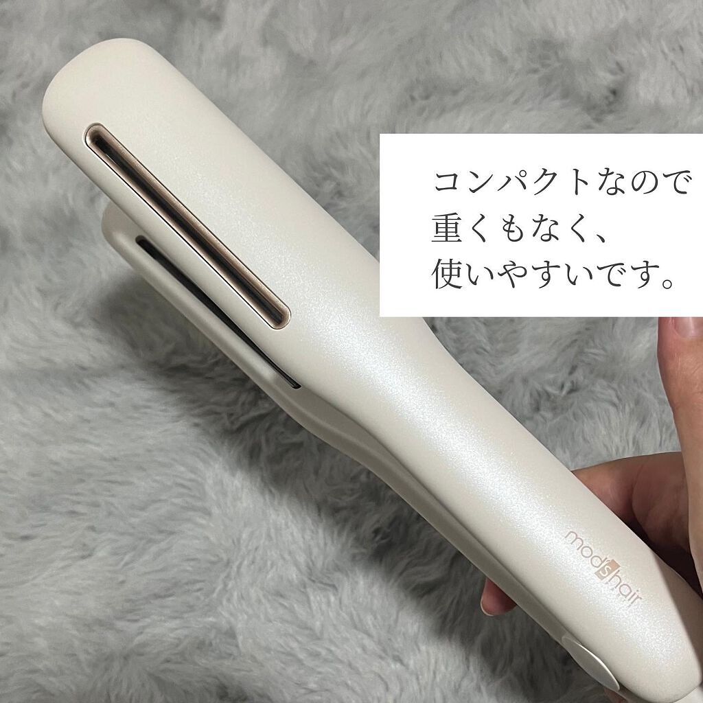 オシャレなデザインになってリニューアル🙌🏻✨ モバイルバッテリーと繋げば、いつでもどこでもスタイリングできちゃう💕 手のひらサイズのコンパクトさでかなり軽い!使用後に収納できるキャップ付きで持ち運びにも便利でかなり有り難い🥹 ピタッと挟めるクッションプレートで軽い力でもしっかり挟めるし、前髪・毛先・顔周りなどのポイントセットやショートの方なら全体にも使いやすいし、メンズのヘアセットにもおすすめ🙆♀️
