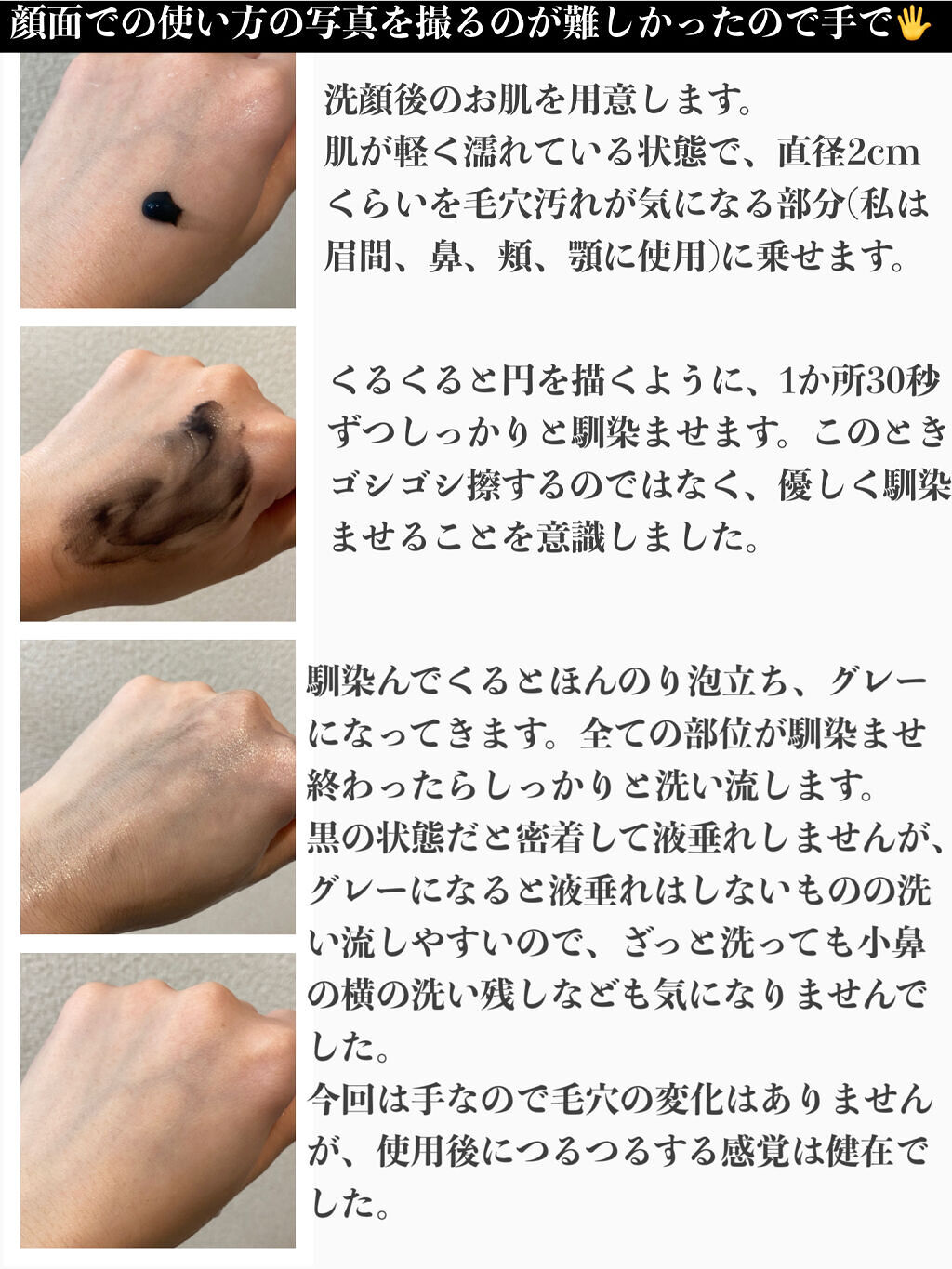 ねっとりしたテクスチャ。週1・2使用のスポットケアなので、あまり量ないですが、そこそこ持ちそう。毛穴にしっかり吸着する割には、そこまで落としづらさがないのが良い点かなと。 毛穴ケアのため、継続して使い続けたいです。