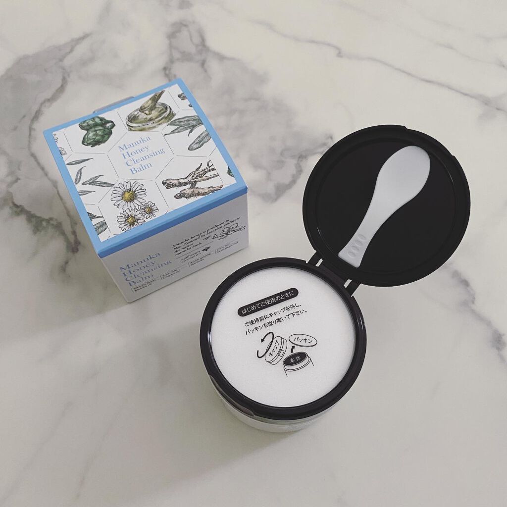 マヌカハニークレンジングバーム🍯.付属のスパチュラでバームを肌にのせて、肌温にとろりととろけるバームは、メイクの上でくるくるするとスルスルメイクと馴染む❤︎.マヌカハニーのおかげか、私は洗い上がりのしっとり感が感じられて満足🫶.抗菌成分を含む...