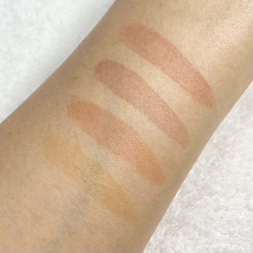 全体的には、名前のとおりヌーディーな印象☺️定番色「01 本命のブラウン」と似てるんだけど、今回の「104 本能のヌードベージュ」の方が、よりヌーディーなカラーとなっておりまする💁🏻♀️ 左上のベージュカラー(1番)は、基本的にはマットカラーなんだけど、ほんのりラメも入ってるから、のっぺりとした印象にならなくて良き🥰 4番のカラーは、ハイライトとして使うこともできるし、個人的には涙袋に使っても良いのではないかと思っておりまする👻 こちらは、全体的にしっとりとしたテクスチャーとなっておりまする💖そして、上2色のマットカラーが、結構しっかり発色してくれます❣️ 右下のハイライトカラーも、「104 本能のヌードベージュ」ほど白っぽくならないので、さりげなくハイライトを入れたい人にピッタリ✨