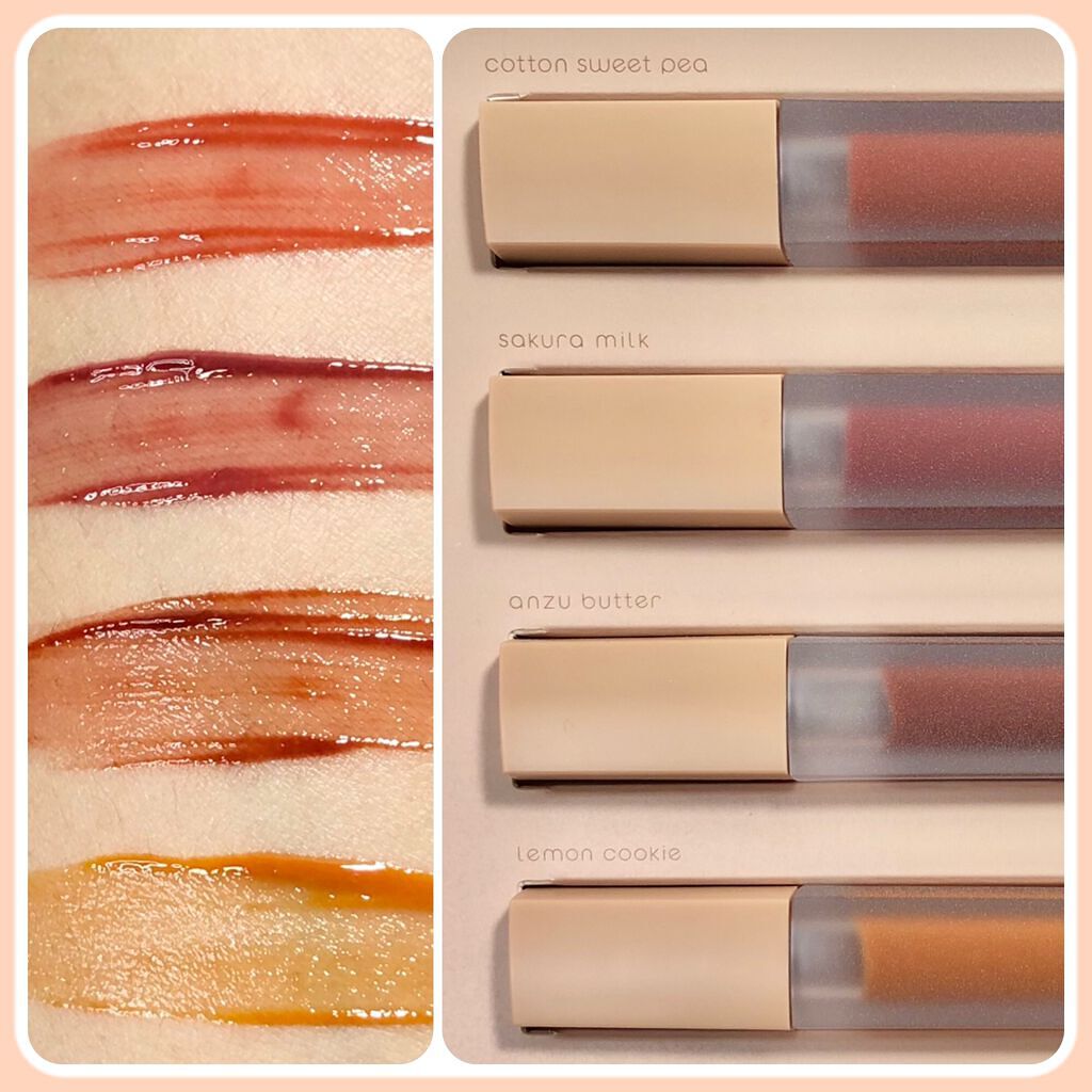 - <01 れもんクッキー> ジフェニルジメチコン、水、リンゴ酸ジイソステアリル、ビスジグリセリルポリアシルアジペート-2、オクチルドデカノール、水添ポリイソブテン、ダイマージリノール酸ダイマージリノレイルビス(ベヘニル/イソステアリル/フィトステリル)、ジグリセリン、DPG、セチルPEG/PPG-10/1ジメチコン、イソステアリン酸ソルビタン、ポリソルベート60、スクワラン、アーモンド油、オリーブ果実油、アルガニアスピノサ核油、カニナバラ果実エキス、トリ(カプリル酸/カプリン酸)グリセリル、グリセリン、ステビオシド、(アクリル酸ヒドロキシエチル/アクリロイルジメチルタウリンNa)コポリマー、ポリグリセリン-3、ペンチレングリコール、エチルヘキシルグリセリン、セテアレス-20、テトラ(ジ-t-ブチルヒドロキシヒドロケイヒ酸)ペンタエリスリチル、フェノキシエタノール、香料、酸化チタン、酸化鉄、赤227、黄4、黄5 <02 あんずバター> ジフェニルジメチコン、水、リンゴ酸ジイソステアリル、ビスジグリセリルポリアシルアジペート-2、オクチルドデカノール、水添ポリイソブテン、ダイマージリノール酸ダイマージリノレイルビス(ベヘニル/イソステアリル/フィトステリル)、ジグリセリン、DPG、セチルPEG/PPG-10/1ジメチコン、イソステアリン酸ソルビタン、ポリソルベート60、スクワラン、アーモンド油、オリーブ果実油、アルガニアスピノサ核油、カニナバラ果実エキス、トリ(カプリル酸/カプリン酸)グリセリル、グリセリン、ステビオシド、(アクリル酸ヒドロキシエチル/アクリロイルジメチルタウリンNa)コポリマー、ポリグリセリン-3、ペンチレングリコール、エチルヘキシルグリセリン、セテアレス-20、テトラ(ジ-t-ブチルヒドロキシヒドロケイヒ酸)ペンタエリスリチル、フェノキシエタノール、香料、酸化チタン、酸化鉄、赤227、黄4、黄5 <03 さくらミルク > ジフェニルジメチコン、水、リンゴ酸ジイソステアリル、ビスジグリセリルポリアシルアジペート-2、オクチルドデカノール、水添ポリイソブテン、ダイマージリノール酸ダイマージリノレイルビス(ベヘニル/イソステアリル/フィトステリル)、ジグリセリン、DPG、セチルPEG/PPG-10/1ジメチコン、イソステアリン酸ソルビタン、ポリソルベート60、スクワラン、アーモンド油、オリーブ果実油、アルガニアスピノサ核油、カニナバラ果実エキス、トリ(カプリル酸/カプリン酸)グリセリル、グリセリン、ステビオシド、(アクリル酸ヒドロキシエチル/アクリロイルジメチルタウリンNa)コポリマー、ポリグリセリン-3、ペンチレングリコール、エチルヘキシルグリセリン、セテアレス-20、テトラ(ジ-t-ブチルヒドロキシヒドロケイヒ酸)ペンタエリスリチル、フェノキシエタノール、香料、酸化チタン、赤227、黄4、青1 <04 コットンスイートピー > ジフェニルジメチコン、水、リンゴ酸ジイソステアリル、ビスジグリセリルポリアシルアジペート-2、オクチルドデカノール、水添ポリイソブテン、ダイマージリノール酸ダイマージリノレイルビス(ベヘニル/イソステアリル/フィトステリル)、ジグリセリン、DPG、セチルPEG/PPG-10/1ジメチコン、イソステアリン酸ソルビタン、ポリソルベート60、スクワラン、アーモンド油、オリーブ果実油、アルガニアスピノサ核油、カニナバラ果実エキス、トリ(カプリル酸/カプリン酸)グリセリル、グリセリン、ステビオシド、(アクリル酸ヒドロキシエチル/アクリロイルジメチルタウリンNa)コポリマー、ポリグリセリン-3、ペンチレングリコール、エチルヘキシルグリセリン、セテアレス-20、テトラ(ジ-t-ブチルヒドロキシヒドロケイヒ酸)ペンタエリスリチル、フェノキシエタノール、香料、酸化チタン、酸化鉄、赤104(1)、黄5、青1 <05 チョコレートコスモス> ジフェニルジメチコン、水、リンゴ酸ジイソステアリル、ビスジグリセリルポリアシルアジペート-2、オクチルドデカノール、水添ポリイソブテン、ダイマージリノール酸ダイマージリノレイルビス(ベヘニル/イソステアリル/フィトステリル)、ジグリセリン、DPG、セチルPEG/PPG-10/1ジメチコン、イソステアリン酸ソルビタン、ポリソルベート60、スクワラン、アーモンド油、オリーブ果実油、アルガニアスピノサ核油、カニナバラ果実エキス、トリ(カプリル酸/カプリン酸)グリセリル、グリセリン、ステビオシド、(アクリル酸ヒドロキシエチル/アクリロイルジメチルタウリンNa)コポリマー、ポリグリセリン-3、ペンチレングリコール、エチルヘキシルグリセリン、セテアレス-20、テトラ(ジ-t-ブチルヒドロキシヒドロケイヒ酸)ペンタエリスリチル、フェノキシエタノール、香料、酸化チタン、酸化鉄、赤227、黄4、黄5、青1 <06 ももゼリー> ジフェニルジメチコン、水、リンゴ酸ジイソステアリル、ビスジグリセリルポリアシルアジペート-2、オクチルドデカノール、水添ポリイソブテン、ダイマージリノール酸ダイマージリノレイルビス(ベヘニル/イソステアリル/フィトステリル)、ジグリセリン