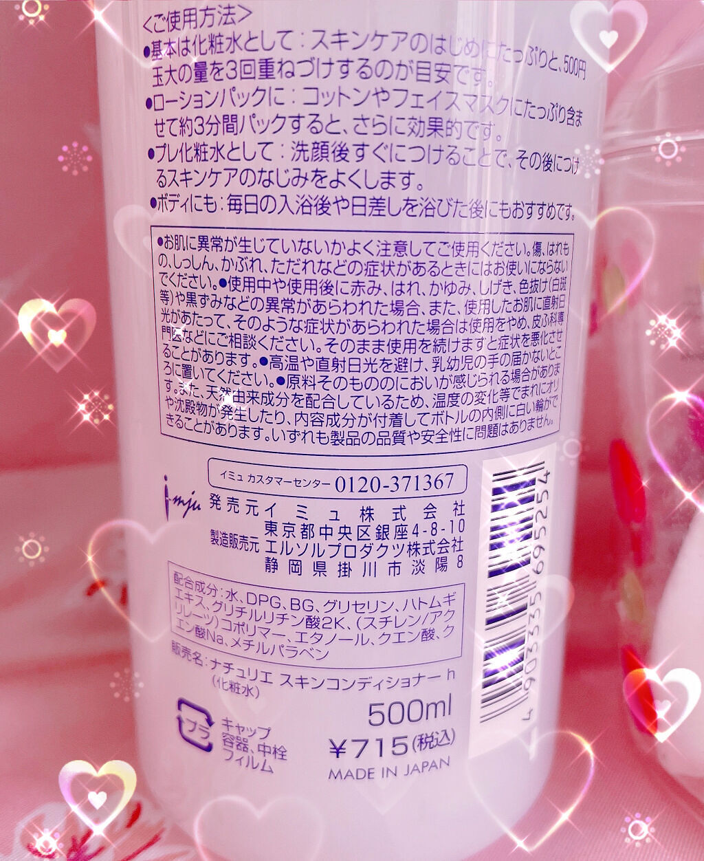 - <通常サイズ 500ml> 水、DPG、BG、グリセリン、ハトムギエキス、グリチルリチン酸2K、(スチレン/VP)コポリマー、クエン酸、クエン酸Na、メチルパラベン <500ml+ 限定ムーミンデザインボトル> 水、DPG、BG、グリセリン、ハトムギエキス、グリチルリチン酸2K、(スチレン/VP)コポリマー、クエン酸、クエン酸Na、メチルパラベン <詰め替えタイプ 480ml> 水、DPG、BG、グリセリン、ハトムギエキス、グリチルリチン酸2K、(スチレン/VP)コポリマー、クエン酸、クエン酸Na、メチルパラベン <旧製品> BG、グリセリン、メチルパラベン、エタノール、グリチルリチン酸2K、ハトムギエキス、DPG、クエン酸Na、プロピルパラベン、クエン酸、(スチレン/アクリレーツ)コポリマー、水 <限定ムーミンデザイン> 水、DPG、BG、グリセリン、ハトムギエキス、グリチルリチン酸2K、(スチレン/VP)コポリマー、クエン酸、クエン酸Na、メチルパラベン